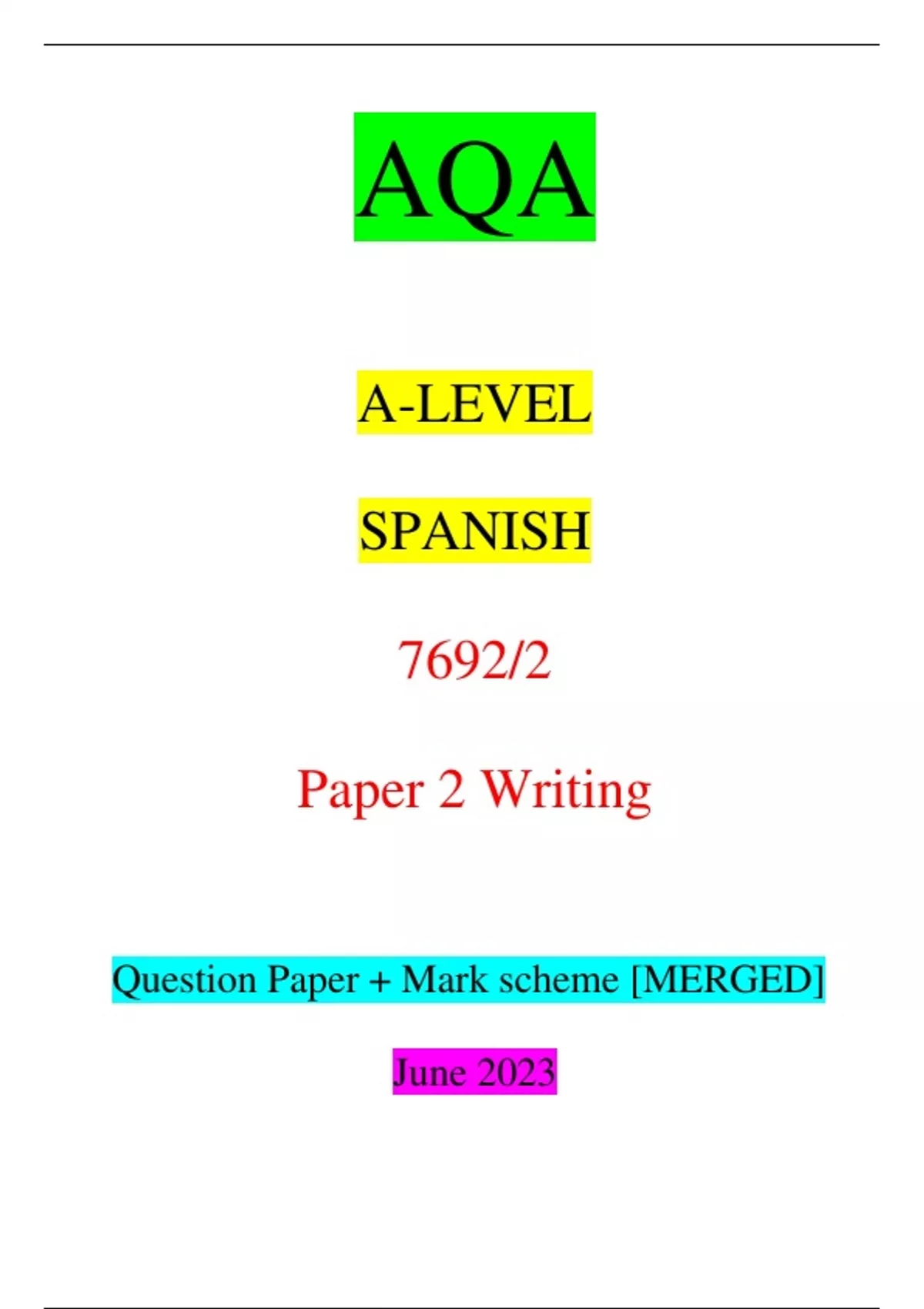 AQA A-LEVEL SPANISH 7692/2 Paper 2 Writing Question Paper + Mark scheme [MERGED] June 2023