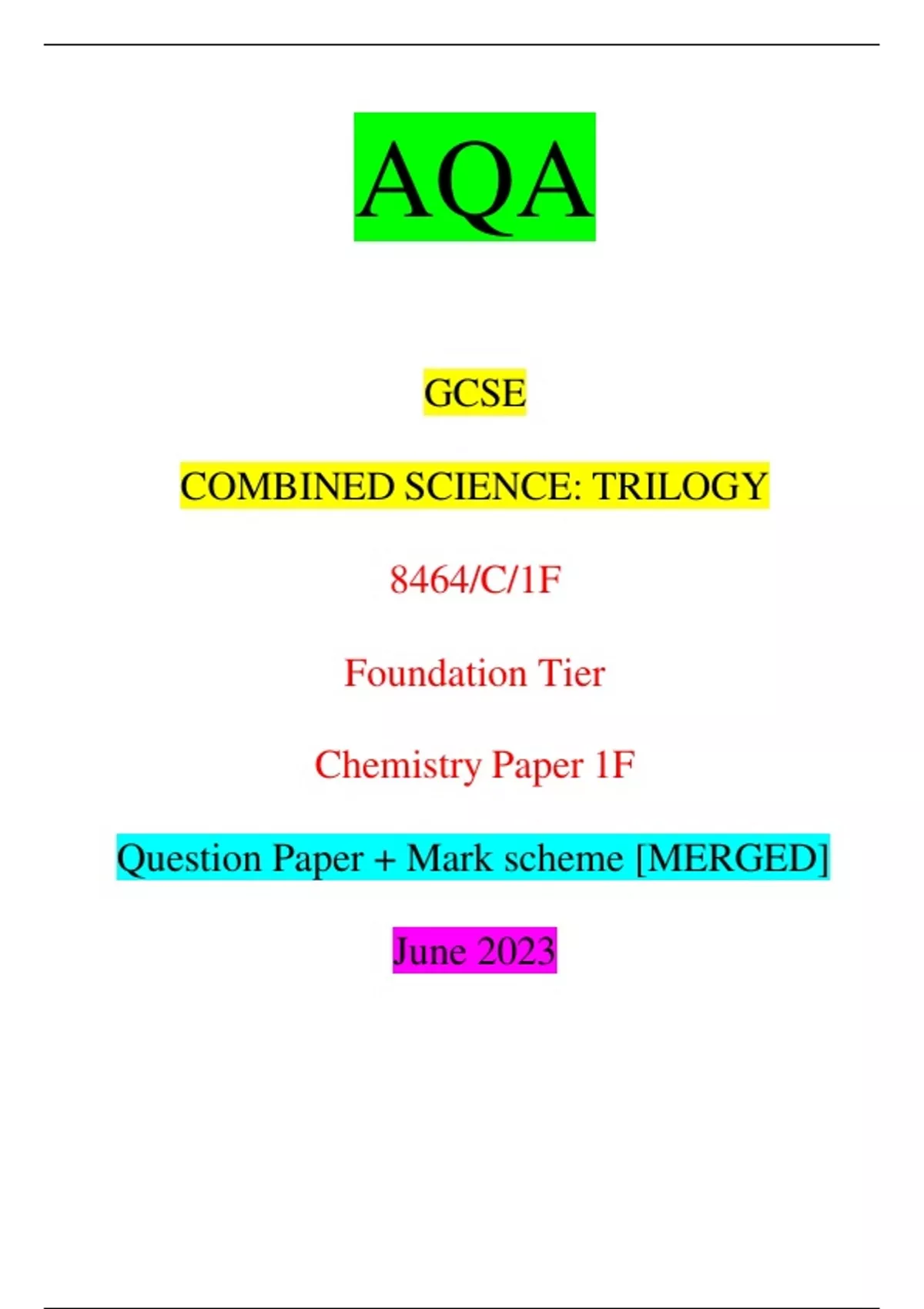 AQA GCSE COMBINED SCIENCE: TRILOGY 8464/C/1F Foundation Tier Chemistry Paper 1F Question Paper + Mark scheme [MERGED] June 2023
