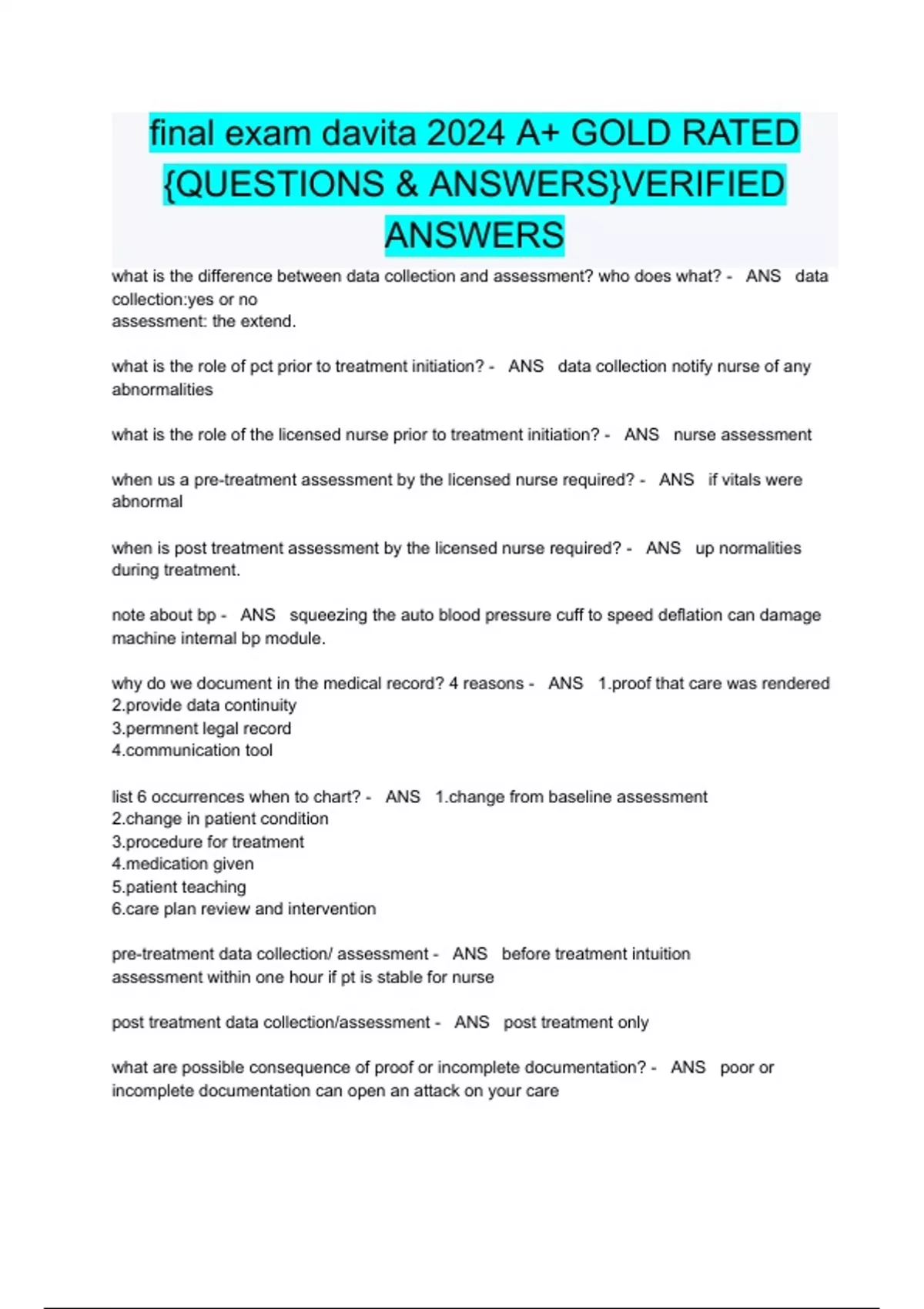 final exam davita 2024 A+ GOLD RATED {QUESTIONS & ANSWERS}VERIFIED ANSWERS