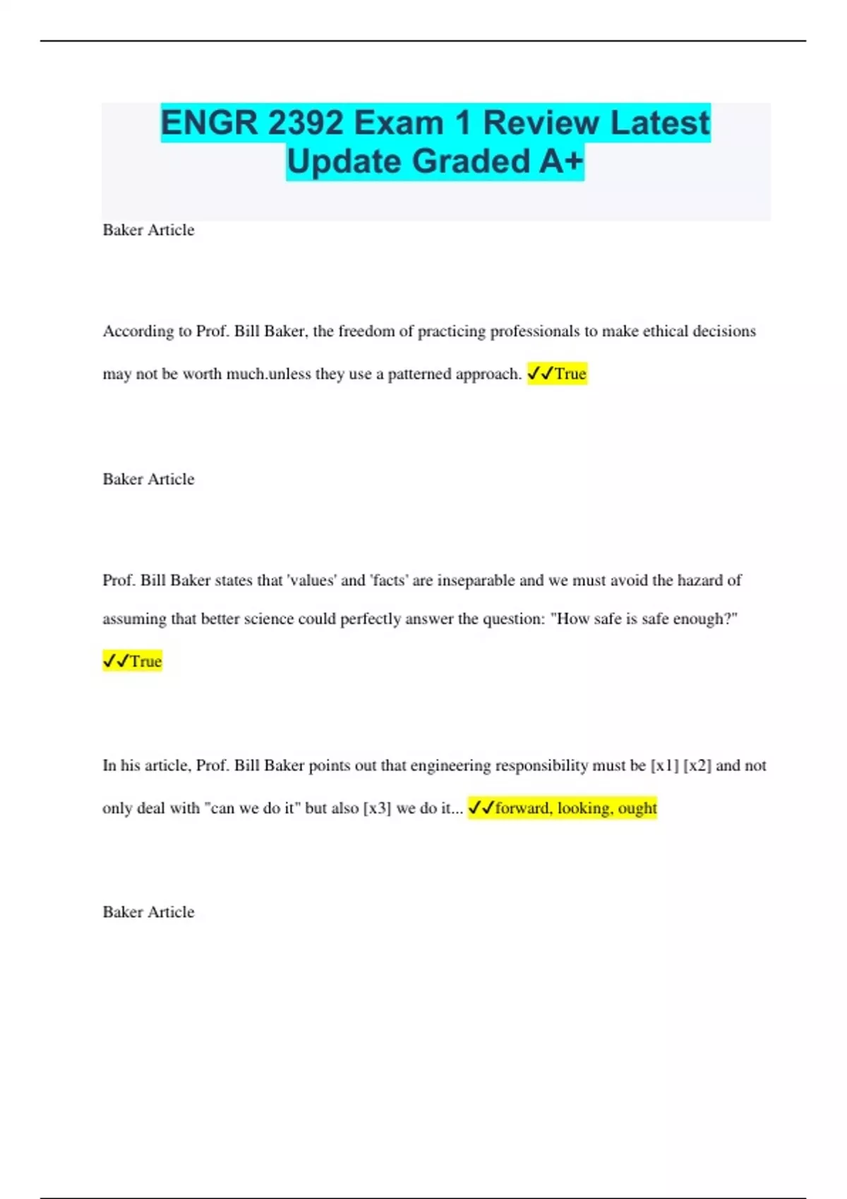 ENGR 2392 Exam 1 Review Latest Update Graded A+ Baker Article According to Prof. Bill Baker, the freedom of practicing professionals to make ethical decisions may not be worth s they use a patterned approach. True Baker Article Prof. Bill Baker states that 'values' and 'facts' are inseparable and we must avoid the hazard of assuming that better science could perfectly answer the question: "How safe is safe enough?" True In his article, Prof. Bill Baker points out that engineering responsibility must be [x1] [x2] and not only deal with "can we do it" but also [x3] we do it... forward, looking, ought Baker Article Prof. Bill Baker states that the primary function of analytical philosophy is to identify positive and negative outcomes for all stakeholders resulting from ethical decisions made by practicing professionals. False Baker Article Professionalism entails not only responsibilities, but rights as well, according to Prof. Bill Baker. True Intuition Philosopher and writer David Sosa maintains that intuitions should be treated as unreliable under any and all conditions. Intuitive judgments are intrinsically more flawed than introspective judgments or perceptive judgments. False Intuition Intuition is defined as an insight that just seems to be true or correct. Intuition is not the result of perception, introspection or explicit inference. True Intuition The criticisms mentioned in the article and lecture are intended to introduce doubt about the reliability of intuitions instead of proving that they are always flawed. True Intuition When we examine the reliability of intuitions, we do so by looking at our reasoning processes. True Intuition Intuitions as discussed in this course are presented as an ethical theory on a level equal to Utilitarianism, Respect for Persons and Virtue Ethics. False Intuitions are not an ethical theory since they do not provide answers to three basic questions (1) What is the a supreme principle of morality? (2) How to solve moral problems? and (3) What kind of persons should we be? Utilitarianism One of the most important concepts in utilitarianism is determining what is meant by the term "good" Utilitarianism Prescription (as opposed to description) is the central concern of an engineering ethics course. True Utilitarianism The ethical systems of Jeremy Bentham and John Stuart Mill are referred to as [x1] utilitarianism. hedonistic Utilitarianism:-- Which of the following attributes are important