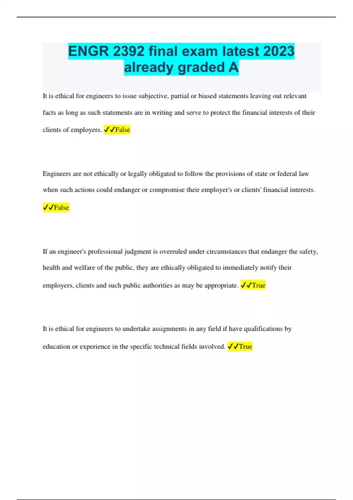 ENGR 2392 final exam latest 2023 already graded A It is ethical for engineers to issue subjective, partial or biased statements leaving out relevant facts as long as such statements are in writing and serve to protect the financial interests of their clients of employers. False Engineers are not ethically or legally obligated to follow the provisions of state or federal law when such actions could endanger or compromise their employer's or clients' financial interests. False If an engineer's professional judgment is overruled under circumstances that endanger the safety, health and welfare of the public, they are ethically obligated to immediately notify their employers, clients and such public authorities as may be appropriate. True It is ethical for engineers to undertake assignments in any field if have qualifications by education or experience in the specific technical fields involved. True It is unethical for engineers to permit the use of their names or associates names in business ventures with any person or firm that they believe is engaged in a fraudulent or dishonest enterprise. True It is unethical for engineers to participate in any matter involving an undisclosed conflict of interest that could influence or appear to influence their judgment or the quality of their services. True It is ethical for engineers to publicly express technical opinions that are founded upon their knowledge of the facts and competence in the subject matter. True It is ethical for engineers to sign and seal engineering plans or documents for which they lack competence if they have a good faith belief that such plans or documents were competently prepared by another qualified engineer. False It is ethical for engineers to issue statements, criticisms or arguments on technical matters in which they are competent that are inspired or paid for by interested parties, provided they have prefaced their comments by explicitly disclosing all interested parties on whose behalf they are speaking. True Engineers are ethically obligated to acknowledge their errors only after consulting with their employers or clients and only if their clients and employers give their approval. False It is unethical for engineers in public service as members, advisors, or employees of a governmental or quasi-governmental body or department to participate in decisions with respect to services solicited or provided by them or their organizations in private or public engineering practice. True It is ethical for engineers to falsify their qualifications or permit written misrepresentation of their or their associate's qualifications in seeking to win contract awards or other work. False Engineers may ethically accept assignments and assume responsibility for coordination of an entire project, including signing and sealing each technical segment of the plans and documents regardless of their technical competence in the specific fields involved. False Engineers having knowledge of any alleged violation of the code of ethics are allowed a grace period of 30 days during which the violation must be corrected. After the expiration of the 30 day grace period, engineers are ethically obligated to report the violation to appropriate professional bodies, public authorities and to cooperate with the proper authorities in furnishing such information or assistance as may be required. False