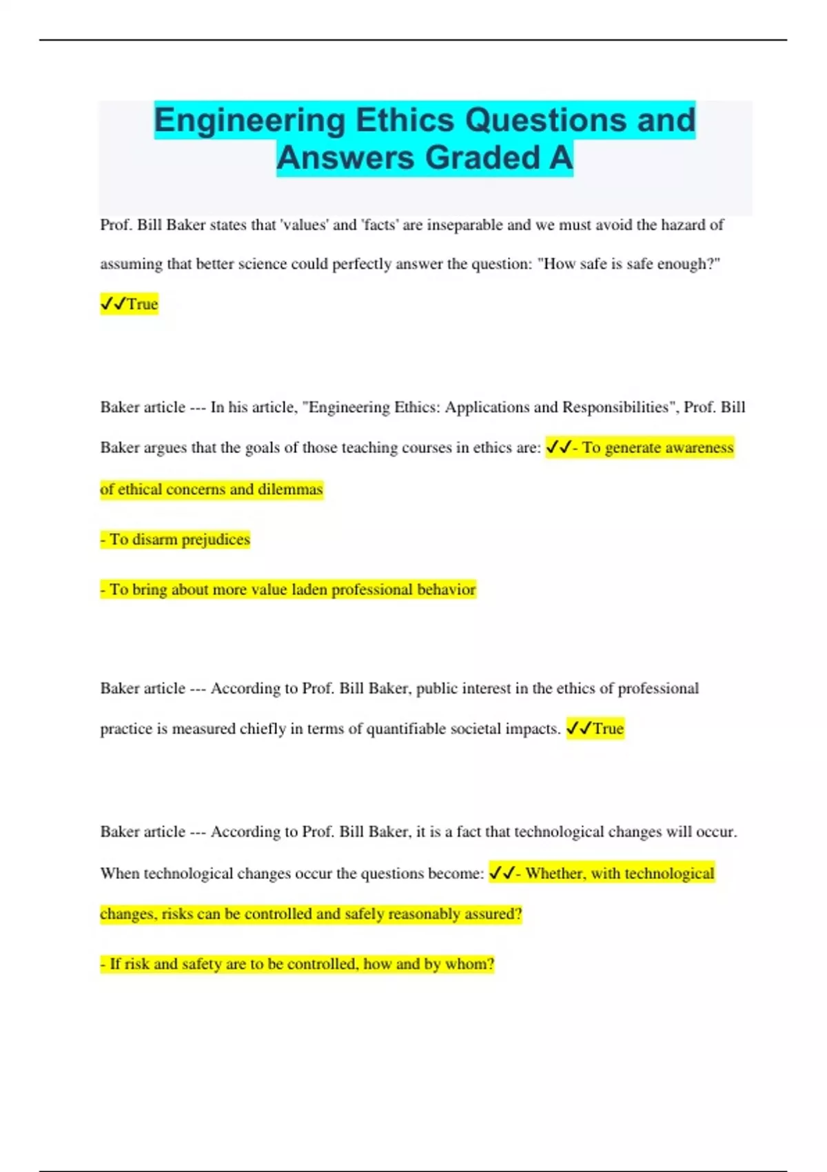 Engineering Ethics Questions and Answers Graded A Prof. Bill Baker states that 'values' and 'facts' are inseparable and we must avoid the hazard of assuming that better science could perfectly answer the question: "How safe is safe enough?" True Baker article --- In his article, "Engineering Ethics: Applications and Responsibilities", Prof. Bill Baker argues that the goals of those teaching courses in ethics are: - To generate awareness of ethical concerns and dilemmas - To disarm prejudices - To bring about more value laden professional behavior Baker article --- According to Prof. Bill Baker, public interest in the ethics of professional practice is measured chiefly in terms of quantifiable societal impacts. True Baker article --- According to Prof. Bill Baker, it is a fact that technological changes will occur. When technological changes occur the questions become: - Whether, with technological changes, risks can be controlled and safely reasonably assured? - If risk and safety are to be controlled, how and by whom? - Whether engineers, individually and as a group, have roles to play in the controlling process? - Whether laws would be passed to protect ethical engineers since the ethical practice of engineering has come to be so highly regarded as a means of protecting the public? Baker article --- ______, ______, and ______ analysis are critical areas in engineering concerns for safety according to Dr. Baker. cost, benefit, risk Baker article --- In his article, Prof. Bill Baker points out that engineering responsibility must be ______ ______ and not only deal with "can we do it" but also ______ we do it. forward, looking, ought Baker article --- Prof. Bill Baker states that the primary function of analytical philosophy is to identify positive and negative outcomes for all stakeholders resulting from ethical decisions made by practicing professionals. False Baker article --- If financial analysis shows dollar benefits will exceed dollar costs, projects are presented as desirable, when "real" costs, even if unquantifiable, may exceed "real" benefits. This amounts to mis......??? True Intuition --- When we examine the reliability of intuitions, we do so by looking at our reasoning process. True Intuition --- Intuition is defined as insight that just seems to be true or correct. Intuition is not the result of perception, introspection or explicit inference. True Intuition --- One can be more confident in the use of intuition in resolving an ethical dilemma if one or more of the following conditions are met. Select the best answer(s): A. A person is not emotionally invested in a particular outcome. B. The ethical issue is simple rather than complex. C. If one intuitive judgement does not conflict with another intuitive judgement. D. Other ethical theories do not apply. A, B, C Intuition --- Intuitions as discussed in this course are presented as an ethical theory on a level equal to Utilitarianism, Respect for Persons and Virtue Ethics. False Intuition --- Philosopher and writer David Sosa maintains that intuitions should be treated as unreliable under any and all conditions. Intuitive judgements are intrinsically more flawed than introspective judgements or perceptive judgements. False Intuition --- The criticisms mentioned in the article and lecture are intended to introduce doubt about the reliability of intuitions instead of proving that they are always flawed. True Utilitarianism --- Pluralistic utilitarians argue that (incorrect answers result in negative partial credit): A. acts that promote one intrinsic good will never negate another intrinsic good B. there is more than one category of intrinsic good C. things like knowledge, friendship and accomplishment are only valued in virtue of their connection to pleasure D. intrinsic good are easily determined B. there is more than one category of intrinsic good Utilitarianism --- ______ utilitarians place an emphasis on rules which when widely followed lead to ______ utility. Rule, an overall increase in Utilitarianism --- Virtues precede the Principle of Utility in Utilitarianism. False Utilitarianism --- Which of the following attributes are important outcomes that result from the application of the principles of utilitarianism? A. concern for other persons B. unambiguous resolution of ethical dilemmas C. consensus building about the right thing to do D. promotion of a positive state of affairs E. universal applicability to ethics in engineering practice F. minimizing the harm to all stakeholders A, B, C, D Utilitarianism --- Pluralistic utilitarians argue that (select the best answer)... A. acts that promote one intrinsic good will never negate another intrinsic good B. there is more than one category of intrinsic good C. things like knowledge, friendship, and accomplishment are only valued in virtue of their connection to pleasure D. intrinsic goods are easily determined E. all of these are part of pluralistic utilitarianism F. none of these are part of pluralistic utilitarianism B. there is more than one category of intrinsic good Utilitarianism --- Act utilitarians permit lying in a situation if doing so will promote the best consequences. True Utilitarianism --- Hedonistic utilitarianism allows for qualitative differences in pleasure. True Utilitarianism --- One of the most important concepts in utilitarianism is: A. that right, wrong, good and bad are terms that can be used interchangeably B. determining what is meant by the term "good" C. that the concept of "good" defines a means to an end, not an end in itself D. that the concept of "good" defines something that is instrumentally valuable B. determining what is meant by the term "good" Utilitarianism --- If one makes the descriptive observation that most people fail to act in accord with utilitarianism, this by itself undermines the claim that we ought to promote the greatest good for the greatest number of people. False Respect for Persons --- Which of the following statemen