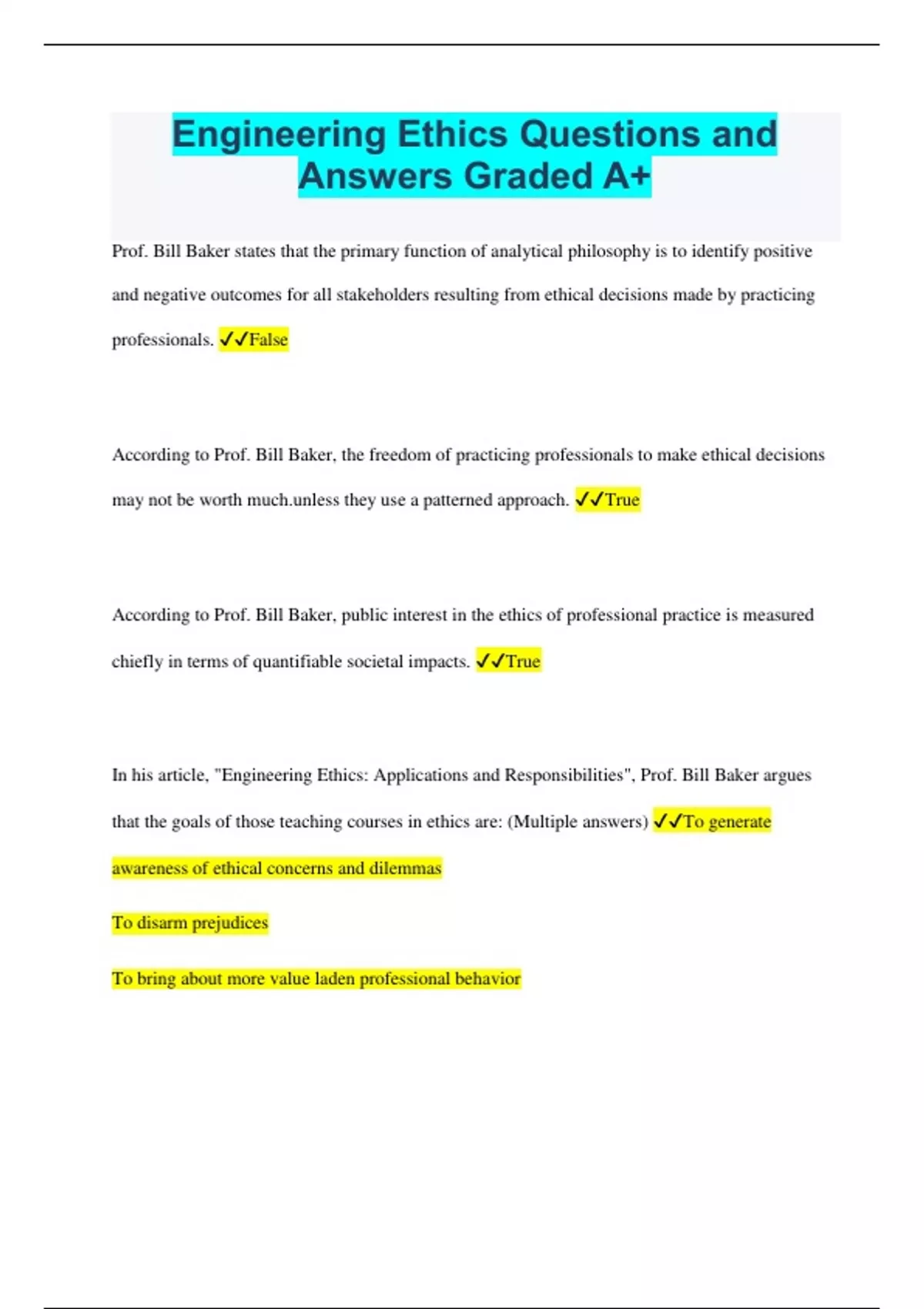 Engineering Ethics Questions and Answers Graded A+ Prof. Bill Baker states that the primary function of analytical philosophy is to identify positive and negative outcomes for all stakeholders resulting from ethical decisions made by practicing professionals. False According to Prof. Bill Baker, the freedom of practicing professionals to make ethical decisions may not be worth s they use a patterned approach. True According to Prof. Bill Baker, public interest in the ethics of professional practice is measured chiefly in terms of quantifiable societal impacts. True In his article, "Engineering Ethics: Applications and Responsibilities", Prof. Bill Baker argues that the goals of those teaching courses in ethics are: (Multiple answers) To generate awareness of ethical concerns and dilemmas To disarm prejudices To bring about more value laden professional behavior If financial analysis shows dollar benefits will exceed dollar costs, projects are presented as desirable, when "real" costs, even if unquantifiable, may exceed "real" benefits. This amounts to misleading the public, intentionally or otherwise True __________, ___________, and __________ analysis are critical areas in engineering concerns for safety according to Dr. Baker. Cost, Benefit, and Risk Intuitions as discussed in this course are presented as an ethical theory on a level equal to Utilitarianism, Respect for Persons and Virtue Ethics. False One can be more confident in the use of intuition in resolving an ethical dilemma if one or more of the following conditions are met. (Multiple Answers) A person is not emotionally invested in a particular outcome The ethical issue is simple rather than complex. If one intuitive judgment does not conflict with another intuitive judgment. Intuition is defined as an insight that just seems to be true or correct. Intuition is not the result of perception, introspection or explicit inference. True The criticisms mentioned in the article and lecture are intended to introduce doubt about the reliability of intuitions instead of proving that they are always flawed. True When we examine the reliability of intuitions, we do so by looking at our reasoning processes. True Philosopher and writer David Sosa maintains that intuitions should be treated as unreliable under any and all conditions. Intuitive judgments are intrinsically more flawed than introspective judgments or perceptive judgments. False The ethical systems of Jeremy Bentham and John Stuart Mill are referred to as _________ utilitarianism. Hedonistic __________ utilitarians place an emphasis on rules which when widely followed lead to __________ utility. rule; optimal Pluralistic utilitarians argue that: there is more than one category of intrinsic good Jeremy Bentham and John Stuart Mill both claimed that pleasure is not an intrinsic good. False In spite of the problems that arise in the application of one or more forms of utilitarianism, a focus on consequences helps in determining the rightness or wrongness of actions. True Hedonistic utilitarianism allows for qualitative differences in pleasure True Act utilitarians permit lying in a situation if doing so will promote the best consequences. True Act utilitarians place an emphasis on __________ actions. individual Pluralistic utilitarians argue that (select the best answer)...