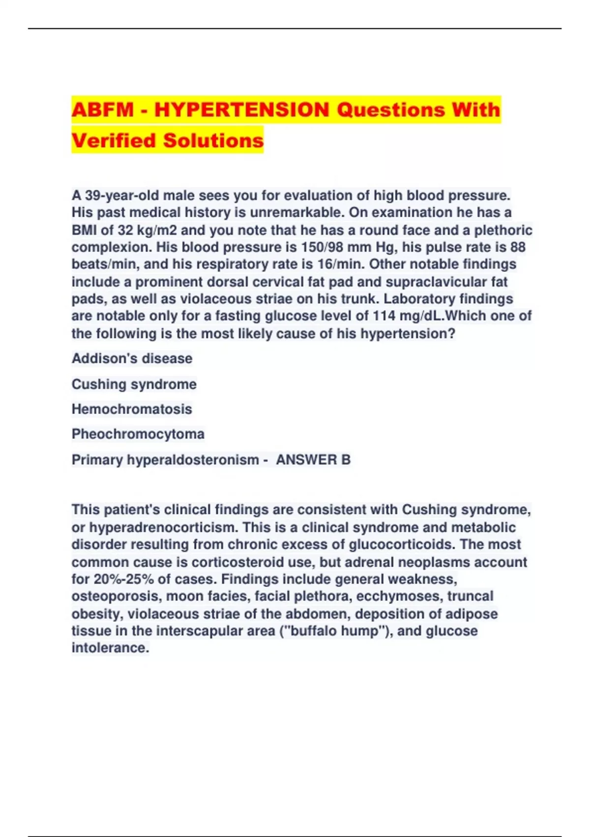 ABFM - HYPERTENSION Questions With Verified Solutions A 39-year-old male sees you for evaluation of high blood pressure. His past medical history is unremarkable. On examination he has a BMI of 32 kg/m2 and you note that he has a round face and a plethoric complexion. His blood pressure is 150/98 mm Hg, his pulse rate is 88 beats/min, and his respiratory rate is 16/min. Other notable findings include a prominent dorsal cervical fat pad and supraclavicular fat pads, as well as violaceous striae on his trunk. Laboratory findings are notable only for a fasting glucose level of 114 mg/dL.Which one of the following is the most likely cause of his hypertension? Addison's disease Cushing syndrome Hemochromatosis Pheochromocytoma Primary hyperaldosteronism - ANSWER B This patient's clinical findings are consistent with Cushing syndrome, or hyperadrenocorticism. This is a clinical syndrome and metabolic disorder resulting from chronic excess of glucocorticoids. The most common cause is corticosteroid use, but adrenal neoplasms account for 20%-25% of cases. Findings include general weakness, osteoporosis, moon facies, facial plethora, ecchymoses, truncal obesity, violaceous striae of the abdomen, deposition of adipose tissue in the interscapular area ("buffalo hump"), and glucose intolerance. You diagnose stage 2 hypertension in a 54-year-old male. His past medical history is otherwise unremarkable and a physical examination is notable for mild AV nicking on funduscopic examination. A baseline EKG reveals evidence of left ventricular hypertrophy.Which one of the following classes of antihypertensive agents has NOT been shown to produce a regression of left ventricular hypertrophy? ACE inhibitors β-Blockers Calcium channel blockers Direct vasodilators Thiazide diuretics - ANSWER D In patients with left ventricular hypertrophy, studies have shown a reduction in left ventricular mass in those treated with ACE inhibitors, diuretics, calcium channel blockers, and β-blockers, with the most consistent reduction achieved with ACE inhibitors and the least with β-blockers. Regression of left ventricular hypertrophy has not been demonstrated with direct vasodilators such as hydralazine and minoxidil. According to currently accepted criteria, hypertension in children is defined as repeated blood pressure measurements at or above a threshold of which one of the following percentiles for age, sex, and height? 80th 85th 90th 95th 99th - ANSWER D In children and adolescents, hypertension is defined as blood pressure at or above the 95th percentile for age, sex, and height, on repeated measurements. Which one of the following conditions is associated with isolated systolic hypertension? Aortic stenosis Hypothyroidism Paget's disease Renovascular hypertension Severe osteoporosis - ANSWER C Isolated elevation of systolic blood pressure can be secondary to conditions associated with elevated cardiac output, such as anemia, Paget's disease, hyperthyroidism, arteriovenou