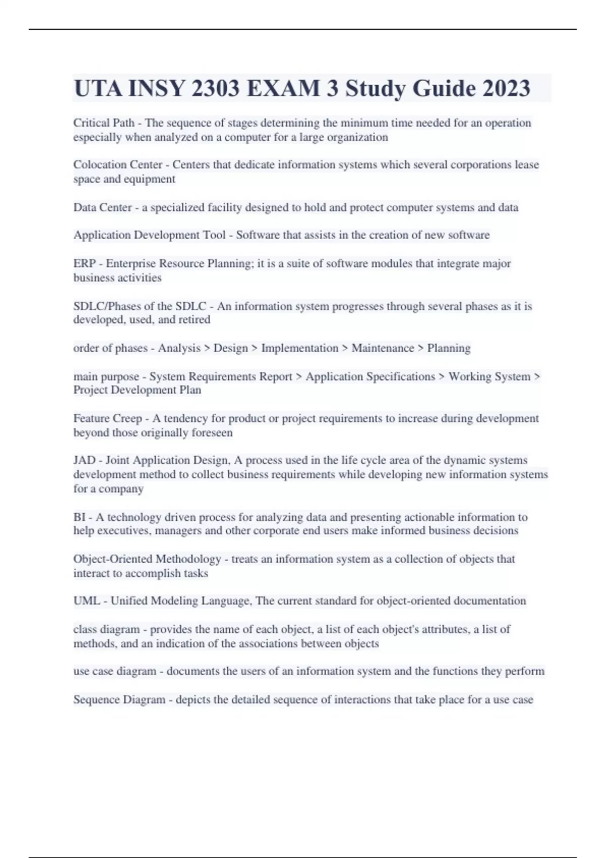 UTA INSY 2303 EXAM 3 Study Guide 2023 Critical Path - The sequence of stages determining the minimum time needed for an operation especially when analyzed on a computer for a large organization Colocation Center - Centers that dedicate information systems which several corporations lease space and equipment Data Center - a specialized facility designed to hold and protect computer systems and data Application Development Tool - Software that assists in the creation of new software ERP - Enterprise Resource Planning; it is a suite of software modules that integrate major business activities SDLC/Phases of the SDLC - An information system progresses through several phases as it is developed, used, and retired order of phases - Analysis Design Implementation Maintenance Planning main purpose - System Requirements Report Application Specifications Working System Project Development Plan Feature Creep - A tendency for product or project requirements to increase during development beyond those originally foreseen JAD - Joint Application Design, A process used in the life cycle area of the dynamic systems development method to collect business requirements while developing new information systems for a company BI - A technology driven process for analyzing data and presenting actionable information to help executives, managers and other corporate end users make informed business decisions Object-Oriented Methodology - treats an information system as a collection of objects that interact to accomplish tasks UML - Unified Modeling Language, The current standard for object-oriented documentation class diagram - provides the name of each object, a list of each object's attributes, a list of methods, and an indication of the associations between objects use case diagram - documents the users of an information system and the functions they perform Sequence Diagram - depicts the detailed sequence of interactions that take place for a use case System Conversion - the process of deactivating an old information system and activating a new one Unit Testing - Each application module is completed undergoes this to ensure that it operates reliably and correctly Integration Testing - Performed to ensure that the modules operate together correctly System Testing - Ensures that all the hardware and software components work together MRP - Material Requirements Planning, A production planning, scheduling, and inventory control system used to manage manufacturing processes. Data Flow Diagram - The core documentation tool for project teams using structured methodology, graphically illustrates how data moves through an information system Success Factors - They also serve as an evaluation checklist at the end of a project Gantt Chart - shows the duration of development tasks as they occur over time WBS - Work breakdown structure - Work breakdown structure, breaks a complete task into a series of subtasks PERT -Program evaluation and review technique - Program evaluation and review technique, used for analyzing the time needed to complete each project task JIT - Just-In-Time manufacturing - A methodology aimed primarily at reducing times within production system as well as response times from suppliers and to customers Horizontal Market - Designed for common elements of many businesses Vertical Market - Designed for a specific industry or enterprise Turnkey System - A computer system that has been customized for a particular application B2B and B2G - Websites such as FedBid, Oracle, & Ingram sell goods and services to other businesses or to the government B2C (business-to-consumer) - Online storefronts such as Zappos, Amazon & Dell offer merchandise and services to consumers