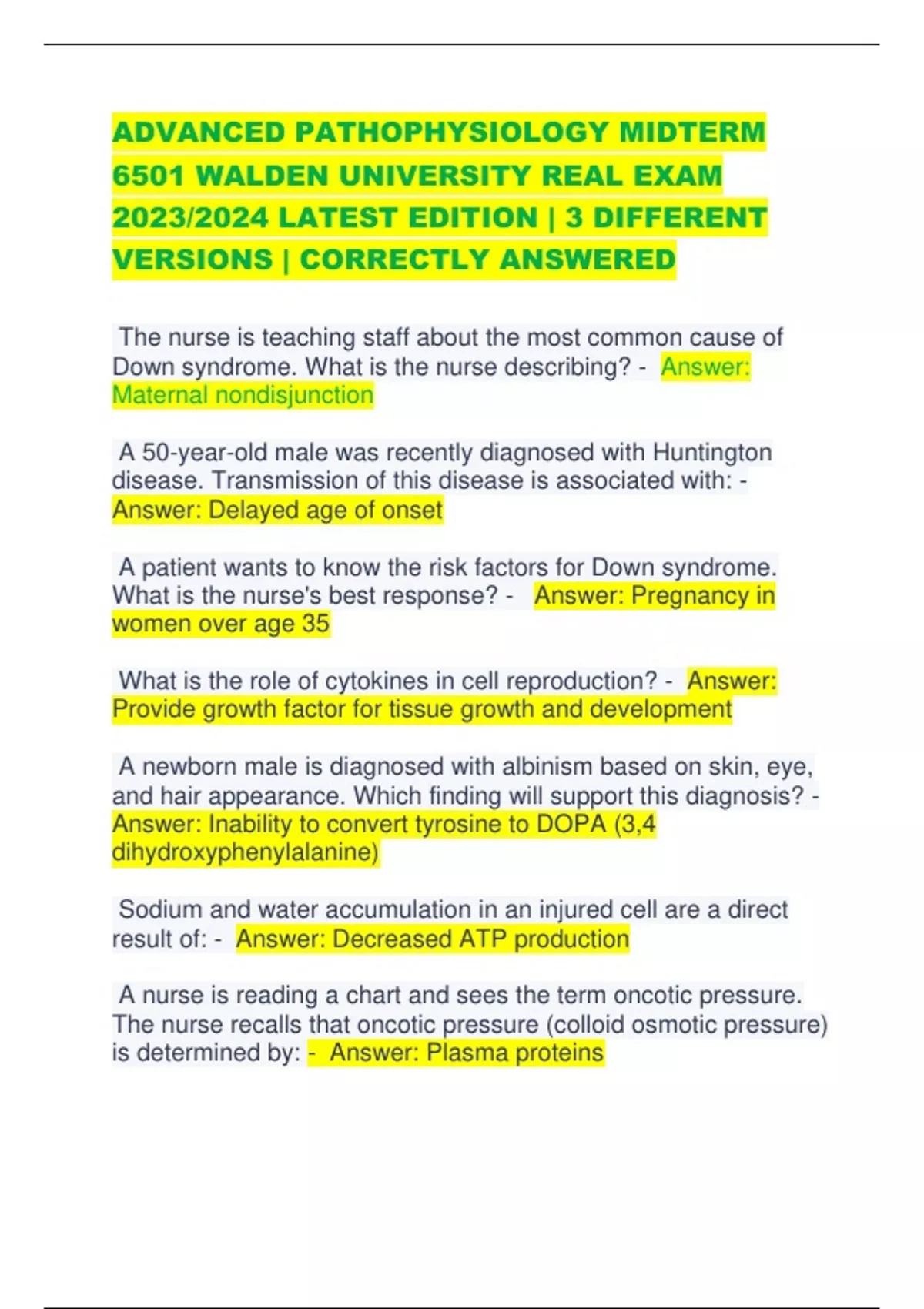 ADVANCED PATHOPHYSIOLOGY MIDTERM 6501 WALDEN UNIVERSITY REAL EXAM 2023/2024 LATEST EDITION | 3 DIFFERENT VERSIONS | CORRECTLY ANSWERED The nurse is teaching staff about the most common cause of Down syndrome. What is the nurse describing? - Answer: Maternal nondisjunction A 50-year-old male was recently diagnosed with Huntington disease. Transmission of this disease is associated with: - Answer: Delayed age of onset A patient wants to know the risk factors for Down syndrome. What is the nurse's best response? - Answer: Pregnancy in women over age 35 What is the role of cytokines in cell reproduction? - Answer: Provide growth factor for tissue growth and development A newborn male is diagnosed with albinism based on skin, eye, and hair appearance. Which finding will support this diagnosis? - Answer: Inability to convert tyrosine to DOPA (3,4 dihydroxyphenylalanine) Sodium and water accumulation in an injured cell are a direct result of: - Answer: Decreased ATP production A nurse is reading a chart and sees the term oncotic pressure. The nurse recalls that oncotic pressure (colloid osmotic pressure) is determined by: - Answer: Plasma proteins The ion transporter that moves Na + and Ca 2+ simultaneously in the same direction is an example of which of the following types of transport? - Answer: Symport A 20-year-old pregnant female gives birth to a stillborn child. Autopsy reveals that the fetus has 92 chromosomes. What term may be on the autopsy report to describe this condition? - Answer: Tetraploidy Why is potassium able to diffuse easily in and out of cells? - Answer: Because the resting plasma membrane is more permeable to potassium Hypothyroidism - ANSWER A disorder caused by a thyroid gland that is slower and less productive than normal, does not produce enough T3 and T4 T3, T4, TSH - ANSWER Diagnosing hypo/hyperthyroidism T3/T4 = thyroid. TSH = Pituitary. T3/T4 abnormality = problem with THYROID. T3/T4 normal + TSH abnormal = Secondary thyroid problem If too much T3/T4, then TSH will be down. Vice Versa. calcium - ANSWER parathyroid glands responsible for regulating ___ levels. metabolism, temperature - ANSWER Thyroid produces hormones T3, T4, and plays big role in __, ___ regulation and growth and development iodine - ANSWER Brain cannot make T3 and T4 without ___ slows - ANSWER hypothyroidism everything ___. stimulates sympathetic nervous system, drowsy, lethargic constipated, food move slows, weight gain body temp increases Hyperthyroidism - ANSWER excessive activity of the thyroid gland: increased levels of T3, T4 and TSH loss - ANSWER Hyperthyroidism: burning calories at an excessive rate weight ___ stimulates sympathetic nervous system: alert, quick reflexes, increased HR & BP (fight or flight response_ Heat intolerance: increased body