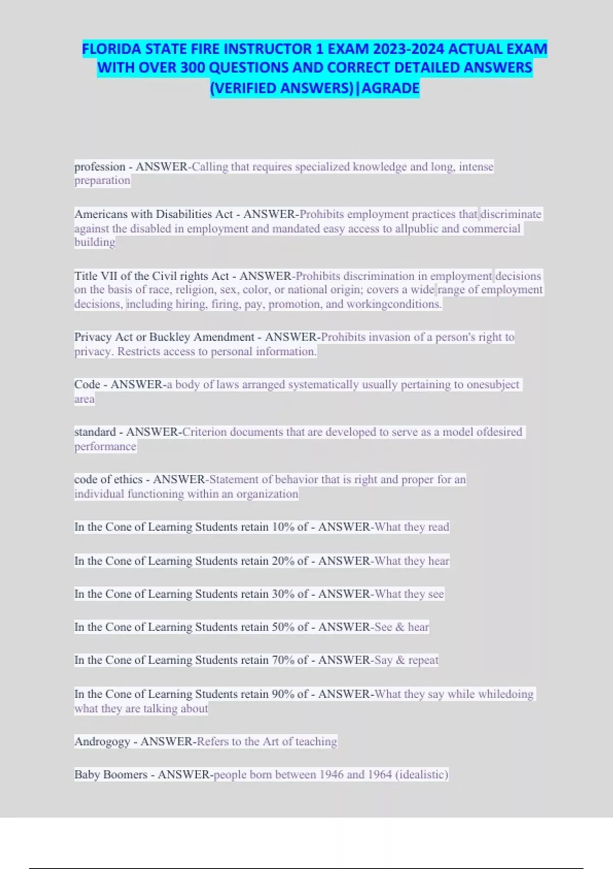 FLORIDA STATE FIRE INSTRUCTOR 1 EXAM ACTUAL EXAM WITH OVER 300 QUESTIONS AND CORRECT DETAILED ANSWERS (VERIFIED ANSWERS)|AGRADE profession - ANSWER-Calling that requires specialized knowledge and long, intense preparation Americans with Disabilities Act - ANSWER-Prohibits employment practices that discriminate against the disabled in employment and mandated easy access to all public and commercial building Title VII of the Civil rights Act - ANSWER-Prohibits discrimination in employment decisions on the basis of race, religion, sex, color, or national origin; covers a wide range of employment decisions, including hiring, firing, pay, promotion, and working conditions. Privacy Act or Buckley Amendment - ANSWER-Prohibits invasion of a person's right to privacy. Restricts access to personal information. Code - ANSWER-a body of laws arranged systematically usually pertaining to one subject area