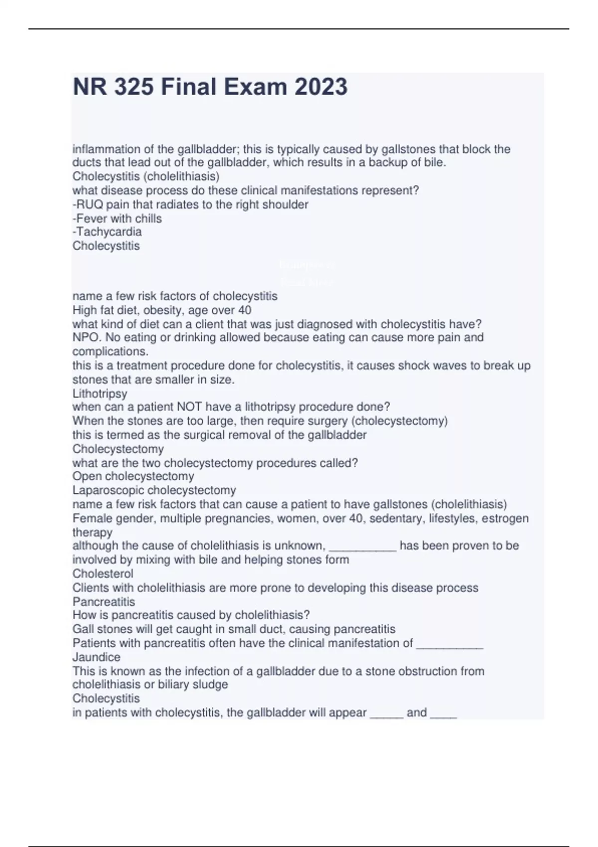 NR 325 Final Exam 2023 inflammation of the gallbladder; this is typically caused by gallstones that block the ducts that lead out of the gallbladder, which results in a backup of bile. Cholecystitis (cholelithiasis) what disease process do these clinical manifestations represent? -RUQ pain that radiates to the right shoulder -Fever with chills -Tachycardia Cholecystitis Brainpower Read More name a few risk factors of cholecystitis High fat diet, obesity, age over 40 what kind of diet can a client that was just diagnosed with cholecystitis have? NPO. No eating or drinking allowed because eating can cause more pain and complications. this is a treatment procedure done for cholecystitis, it causes shock waves to break up stones that are smaller in size. Lithotripsy when can a patient NOT have a lithotripsy procedure done? When the stones are too large, then require surgery (cholecystectomy) this is termed as the surgical removal of the gallbladder Cholecystectomy what are the two cholecystectomy procedures called? Open cholecystectomy Laparoscopic cholecystectomy name a few risk factors that can cause a patient to have gallstones (cholelithiasis) Female gender, multiple pregnancies, women, over 40, sedentary, lifestyles, estrogen therapy although the cause of cholelithiasis is unknown, __________ has been proven to be involved by mixing with bile and helping stones form Cholesterol Clients with cholelithiasis are more prone to developing this disease process Pancreatitis How is pancreatitis caused by cholelithiasis? Gall stones will get caught in small duct, causing pancreatitis Patients with pancreatitis often have the clinical manifestation of __________ Jaundice This is known as the infection of a gallbladder due to a stone obstruction from cholelithiasis or biliary sludge Cholecystitis in patients with cholecystitis, the gallbladder will appear _____ and ____ Edematous & hyperemic these are risk factors of developing cholecystitis, because they slow down the bowels Limited mobility, fasting, anesthesia, diabetes these kind of meals can lead to pain in patients with cholecystitis Fatty meals if patients with cholecystitis become extremely ill, they will develop ___________ Diaphoresis this is termed as chronic inflammation of the gallbladder that increases your chance of developing gallbladder cancer Chronic cholecystitis in patients with chronic cholecystitis, the _____ _____ maybe occluded and will require _________ treatment cystic duct may be occluded antibiotics Gangrenous cholecystitis, pancreatitis, cholangitis, biliary cirrhosis, and subphrenic abscesses are all complications of .... Chronic cholecystitis patients with cholecystitis will be given _______ for pain control. Opioids Clients postop of cholecystitis must be given ________ to help expand their lungs, so they don't develop _______ ______ (atelectasis). analgesics splinted respirations how does urine and stool appear in patients with cholecystitis? Dark amber urine Clay colored stool this is the diagnostic test that is performed for patients with cholecystitis to see the gallstones Ultrasound this diagnostic procedure goes into the gallbladder and scoop out the stones in patients with cholecystitis ERCP How will patients with cholecystitis laboratory test appear? ** LFT, WBC, bilirubin LFT elevation Increased WBC count Increased serum & urinary bilirubin levels Increased serum amylase levels Absence urobilinogen in urine The surgical procedure is preferred in patients with cholecystitis Laparoscopic cholecystectomy when would a patient have an open cholecystectomy performed? If their gallbladder is perforated or if they have gallbladder cancer what must patients avoid after having an open cholecystectomy procedure performed? Heavy, lifting for 4 to 6 weeks to avoid the dehiscence of incisions What is the therapeutic effect of Ursodiol and Chenodial in clients with cholecystitis? These two medications are used in oral dissolution therapy that dissolves the stones this diagnostic test is used for visualization, dilation, placement of stents, or when stones are removed with a basket or pass in the patient's stoo