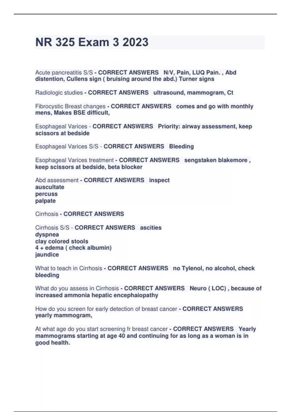 NR 325 Exam 3 2023 Acute pancreatitis S/S - CORRECT ANSWERS N/V, Pain, LUQ Pain. , Abd distention, Cullens sign ( bruising around the abd.) Turner signs Radiologic studies - CORRECT ANSWERS ultrasound, mammogram, Ct Fibrocystic Breast changes - CORRECT ANSWERS comes and go with monthly mens, Makes BSE difficult, Esophageal Varices - CORRECT ANSWERS Priority: airway assessment, keep scissors at bedside Esophageal Varices S/S - CORRECT ANSWERS Bleeding Esophageal Varices treatment - CORRECT ANSWERS sengstaken blakemore , keep scissors at bedside, beta blocker Abd assessment - CORRECT ANSWERS inspect auscultate percuss palpate Cirrhosis - CORRECT ANSWERS Cirrhosis S/S - CORRECT ANSWERS ascities dyspnea clay colored stools 4 + edema ( check albumin) jaundice What to teach in Cirrhosis - CORRECT ANSWERS no Tylenol, no alcohol, check bleeding What do you assess in Cirrhosis - CORRECT ANSWERS Neuro ( LOC) , because of increased ammonia hepatic encephaiopathy How do you screen for early detection of breast cancer - CORRECT ANSWERS yearly mammogram, At what age do you start screening fr breast cancer - CORRECT ANSWERS Yearly mammograms starting at age 40 and continuing for as long as a woman is in good health. When do you start CBE ( clinical breast exam) - CORRECT ANSWERS Clinical breast examination (CBE) at least every 3 years for women between ages 20 and 30 and every year for women beginning at age 40. What are some risk factors for Breast cancer - CORRECT ANSWERS 1.Family history of mother or sister with breast cancer 2.Medical history of cancer of other breast, endometrial cancer, or atypical hyperplasia 3.Menarche before age 12 (early) or menopause after age 50 (late) 4. Lifestyle factors: high-fat diet, obesity, high socioeconomic status, breast trauma, smoking, ingesting more than 2 alcoholic drinks daily At what age do you start BSE - CORRECT ANSWERS Start BSE at age 20 on a monthly schedule When you have a regular mens when do you do BSE - CORRECT ANSWERS Women w/ regular menses perform BSE right after period when breasts are less lumpy and tender. How do you do a self breast exam - CORRECT ANSWERS by using the pads of the fingers, in a circular motion, with hand over head What are the potential complication for mastectomy - CORRECT ANSWERS 1. lymphedema such as edema in hand or arm on operative side, heaviness, or localized pain. 2.Do not perform venipunctures or take BP on affected arm to reduce risk of constriction, infection, and lymphedema in affected arm. 3.Avoid dependent arm position to allow proper wound healing and decrease stress to incision site. What are the post-operative intervention for mastectomy - CORRECT ANSWERS 1- Turn, cough, and deep breathe to prevent respiratory complications. 2- Semi-fowlers position with arm on the affected side elevated on a pillow 3.-Encourage early ROM exercises to prevent contractures and lymphedema, by squeezing a rubber ball after surgery 4 -sign over bed - DO NOT USE affected ARM for BP and BLOOD DRAWS When do you do regular mammogram - CORRECT ANSWERS yearly after 40,- At age 60 the risk increases-Pt w/ mastectomy should still get a - What is BPH (benign prostatic hyperplasia) - CORRECT ANSWERS benign enlargement of prostate gland; results from endocrine changes associated with aging What is the assessment for BPH (benign prostatic hyperplasia) - CORRECT ANSWERS Decreased force and amount of urin