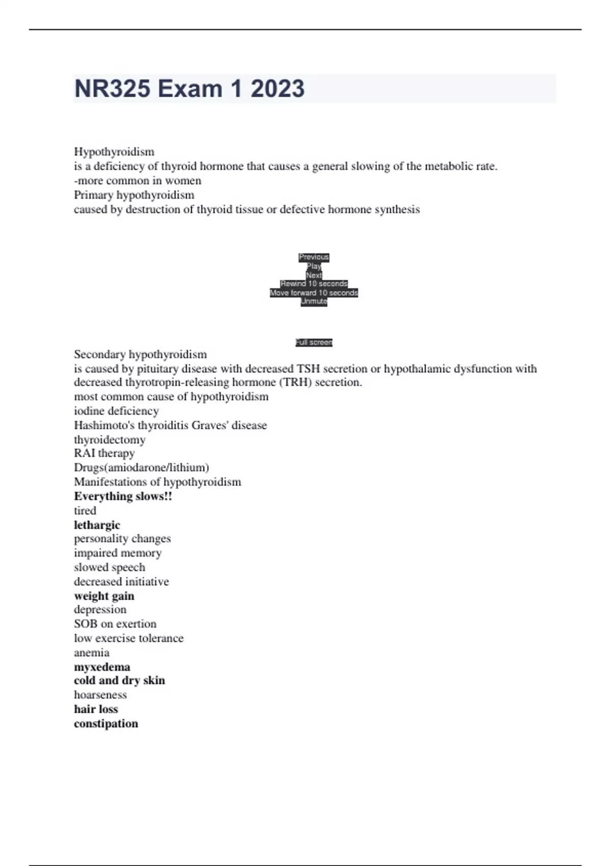 NR325 Exam 1 2023 Hypothyroidism is a deficiency of thyroid hormone that causes a general slowing of the metabolic rate. -more common in women Primary hypothyroidism caused by destruction of thyroid tissue or defective hormone synthesis Brainpower Read More Previous Play Next Rewind 10 seconds Move forward 10 seconds Unmute 0:14 / 0:15 Full screen Secondary hypothyroidism is caused by pituitary disease with decreased TSH secretion or hypothalamic dysfunction with decreased thyrotropin-releasing hormone (TRH) secretion. most common cause of hypothyroidism iodine deficiency Hashimoto's thyroiditis Graves' disease thyroidectomy RAI therapy Drugs(amiodarone/lithium) Manifestations of hypothyroidism Everything slows!! tired lethargic personality changes impaired memory slowed speech decreased initiative weight gain depression SOB on exertion low exercise tolerance anemia myxedema cold and dry skin hoarseness hair loss constipation cold intolerance Complications of hypothyroidism myxedema coma myxedema coma medical emergency -precipitated by infection, drugs , exposure to cold, and trauma. -subnormal temperature, hypotension, and hypoventilation. TX: IV thyroid hormone replacement Labs for hypothyroidism TSH: high T4: low -thyroid antibodies Treatment for hypothryoidism Levothyroxine: start at a low dose, lifelong therapy -low-calorie diet Hyperthyroidism hyperactivity of the thyroid gland with sustained increase in synthesis and release of thyroid hormones. -more common in women Causes of hyperthyroidism Graves' disease toxic nodular goiter thyroiditis excess iodine intake pituitary tumors thyroid cancer thyrotoxicosis physiologic effects or clinical syndrome of hypermetabolism resulting from excess circulating levels of T4, T3, or both. Graves' disease an autoimmune disease of unknown cause characterized by diffuse thyroid enlargement and excess thyroid hormone secretion -antibodies against TSH Manifestations of hyperthyroidism Everything is HYPER! goiter exophthalmos increased appetitie thirst weight loss spleenomegaly/heptomegaly insomnia rapid speech smooth/moist skin thin/brittle nails clubbing diaphoresis heat intolerance Labs for hyperthyroidism Increased T3 & T4 Decreased TSH Complications of hyperthyroidis