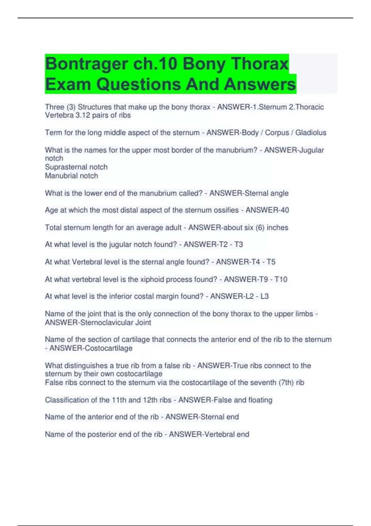 Bontrager ch.10 Bony Thorax Exam Questions And Answers Three (3) Structures that make up the bony thorax - ANSWER-1.Sternum 2.Thoracic Vertebra 3.12 pairs of ribs Term for the long middle aspect of the sternum - ANSWER-Body / Corpus / Gladiolus What is the names for the upper most border of the manubrium? - ANSWER-Jugular notch Suprasternal notch Manubrial notch What is the lower end of the manubrium called? - ANSWER-Sternal angle Age at which the most distal aspect of the sternum ossifies - ANSWER-40 Total sternum length for an average adult - ANSWER-about six (6) inches At what level is the jugular notch found? - ANSWER-T2 - T3 At what Vertebral level is the sternal angle found? - ANSWER-T4 - T5 At what vertebral level is the xiphoid process found? - ANSWER-T9 - T10 At what level is the inferior costal margin found? - ANSWER-L2 - L3 Name of the joint that is the only connection of the bony thorax to the upper limbs - ANSWER-Sternoclavicular Joint Name of the section of cartilage that connects the anterior end of the rib to the sternum - ANSWER-Costocartilage What distinguishes a true rib from a false rib - ANSWER-True ribs connect to the sternum by their own costocartilage False ribs connect to the sternum via the costocartilage of the seventh (7th) rib Classification of the 11th and 12th ribs - ANSWER-False and floating Name of the anterior end of the rib - ANSWER-Sternal end Name of the posterior end of the rib - ANSWER-Vertebral end Name for the aspect of the ribs which articulates with the transverse process of the thoracic vertebrae - ANSWER-Tubercle Three (3) structures found within the costal groove of each rib - ANSWER-1.Artery 2.Vein 3.Nerve The end of the rib that is most superior - ANSWER-Posterior vertebral end The end of the rib that is most inferior - ANSWER-Anterior sternal end Difference in height between the two ends of a rib - ANSWER-3 to 5 inches Rib that articulates with the upper lateral aspect of the manubrium of the sternum - ANSWER-First (1st) rib - anterior sternal end What rib attaches to the sternal angle? - ANSWER-Second rib Ribs at which the bony thorax is the widest at the lateral margins - ANSWER-Eighth (8th) or Ninth (9th) ribs Minimum number of rib pairs that must be demonstrated on an acceptable radiograph (PA cxr) - ANSWER-10 posterior ribs Movement type of the 1st sternocostal joint - ANSWER-Immovable - synarthrodial Movement type of the 1st sternocostal joint (between 1st rib and sternum) - ANSWERCartilagenous, synarthrodial Movement type of the 1st through 12th costovertebral joints - ANSWER-Movable - diarthrodial (plane or gliding) Movement type of the 1st through 10th costochondral unions (between costocartilage and ribs) - ANSWER-Immovable - synarthrodial Movement type of the 1st througth 10th costotransverse joints (between ribs and transverse processes of T vertebrae) - ANSWER-Movable - diarthrodial (plane or gliding) Movement type of the 2nd through 7th sternocostal joints (between 2nd and 7th ribs and sternum) - ANSWER-Movable - diarthrodial (plane or gliding) Movement type of 6th through 10th interchondral joints (between anterior 6th through 10th costal cartilage) - ANSWER-Movable - diarthrodial (plane or gliding) Classification for rib joints that have diarthrodial movement - ANSWER-Synovial Numbered pairs of ribs that are classified as True - ANSWER-1st through 7th ribs Numbered pairs of ribs that are classified as false - ANSWER-8th through 12th ribs Numbered pairs of ribs that are classified as floating - ANSWER-11th through 12th ribs Characteristic that makes a rib a true rib - ANSWER-It attaches to t