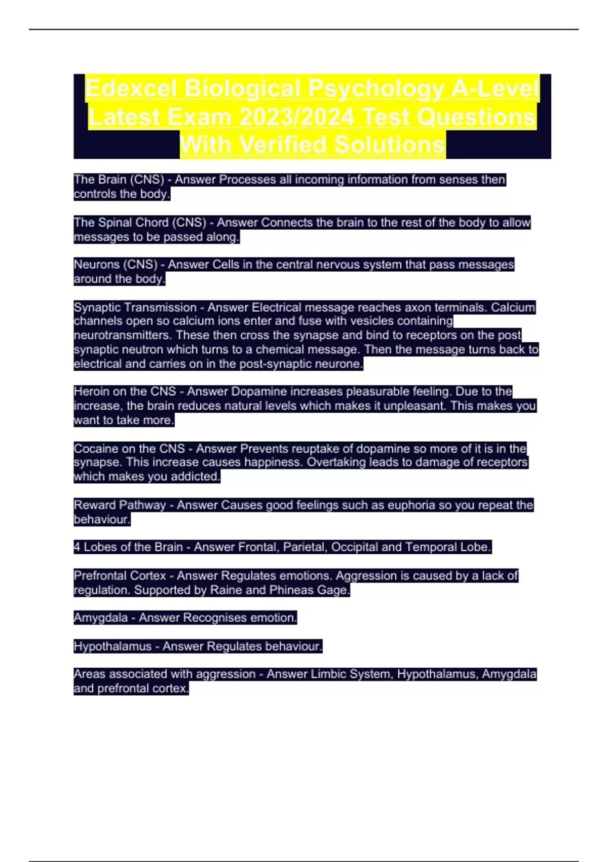 Edexcel Biological Psychology A-Level Latest Exam 2023/2024 Test Questions With Verified Solutions