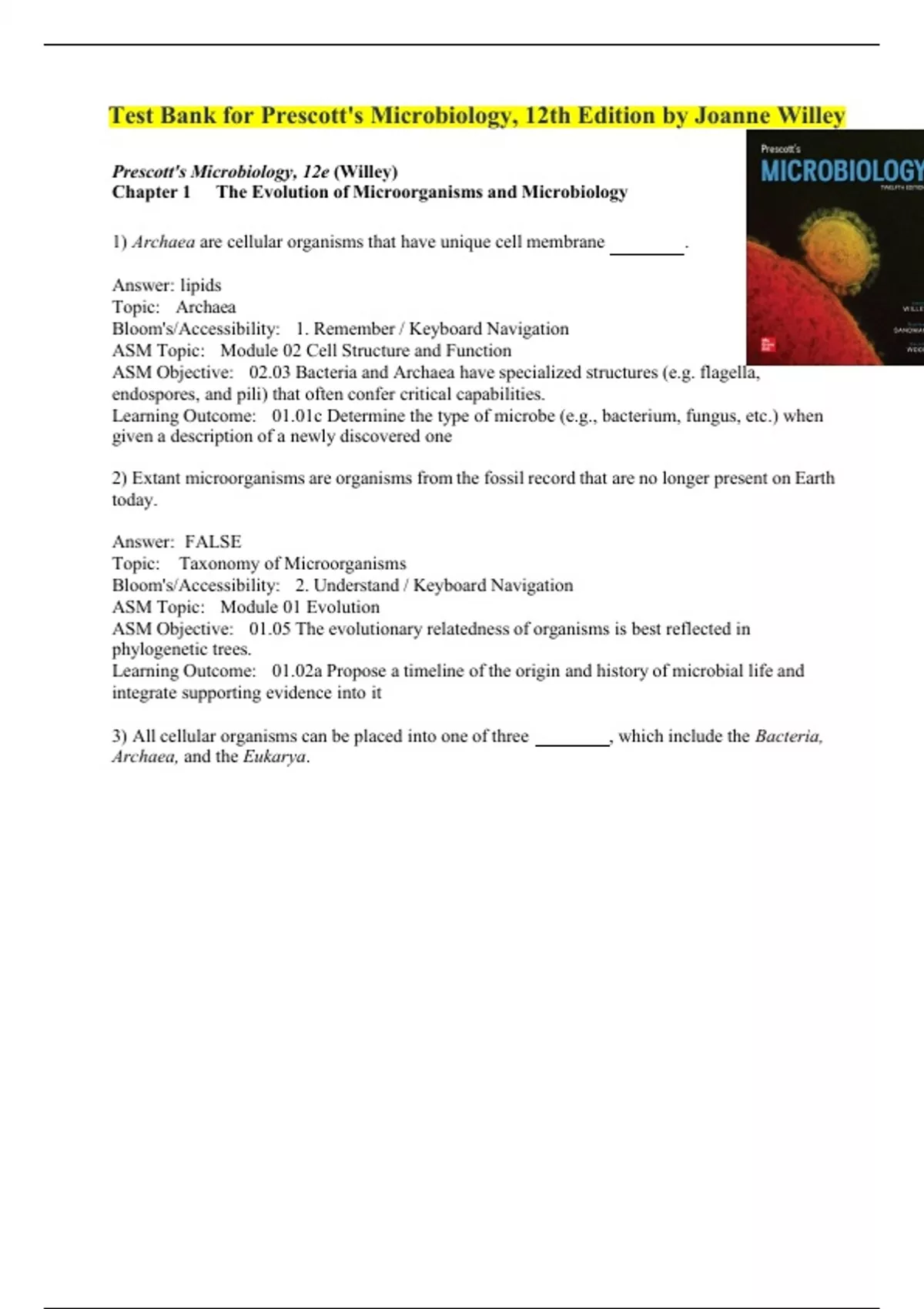 TEST BANK For Prescott's Microbiology, 12th Edition by Joanne Willey| Verified Chapter's 1 - 42 | Complete///TEST BANK For Prescott's Microbiology, 12th Edition by Joanne Willey| Verified Chapter's 1 - 42 | Complete