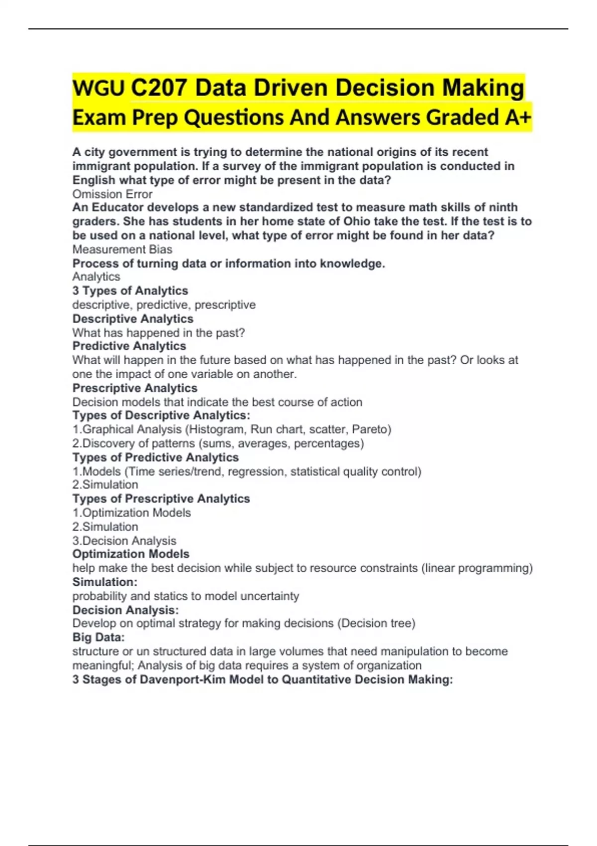 WGU C207 Data Driven Decision Making Exam Prep Questions And Answers Graded A+