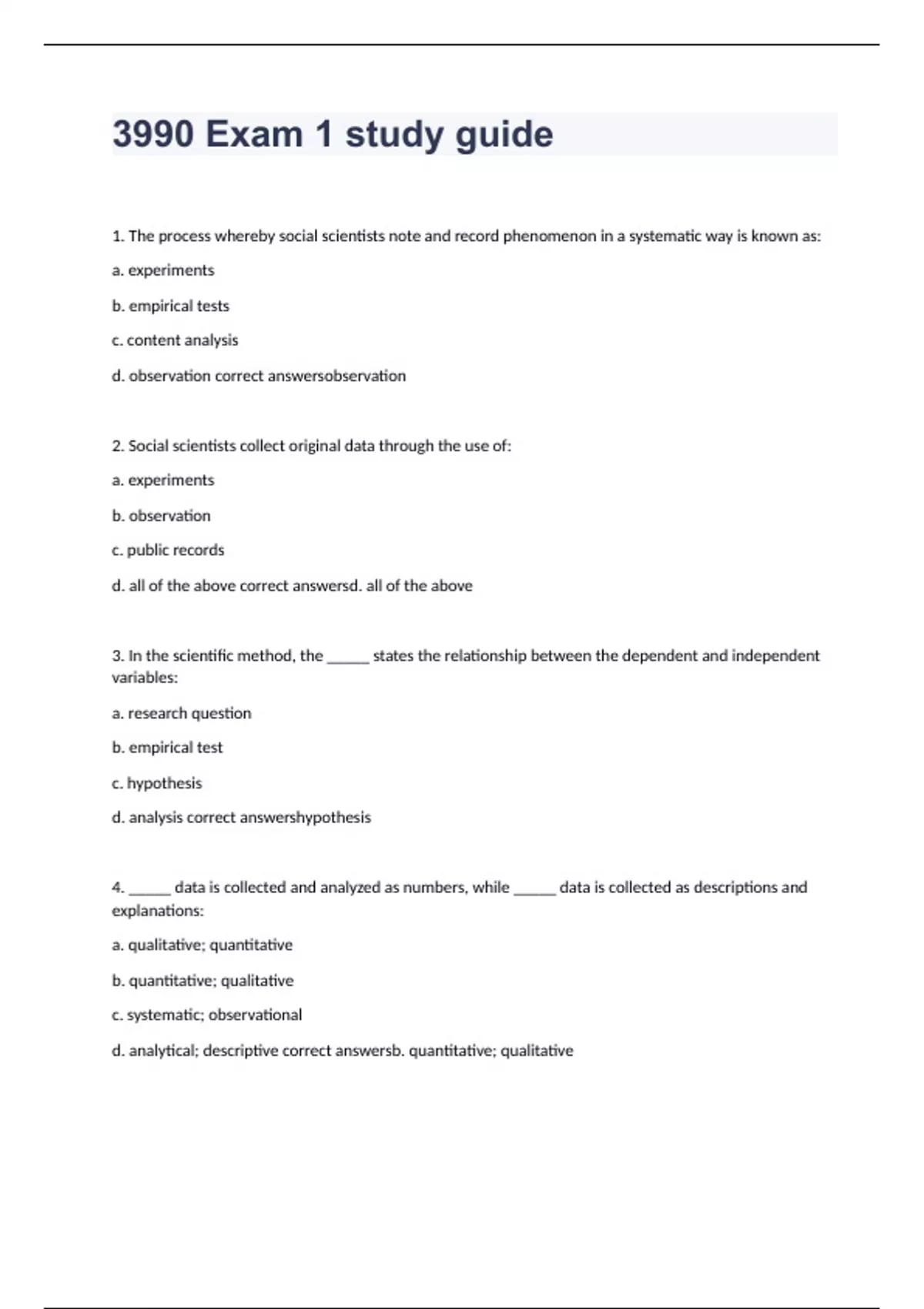 1. The process whereby social scientists note and record phenomenon in a systematic way is known as: a. experiments b. empirical tests c. content analysis d. observation correct answersobservation 2. Social scientists collect original data through the use of: a. experiments b. observation c. public records d. all of the above correct answersd. all of the above 3. In the scientific method, the _____ states the relationship between the dependent and independent variables: a. research question b. empirical test c. hypothesis d. analysis correct answershypothesis 4. _____ data is collected and analyzed as numbers, while _____ data is collected as descriptions and explanations: a. qualitative; quantitative b. quantitative; qualitative c. systematic; observational d. analytical; descriptive correct answersb. quantitative; qualitative