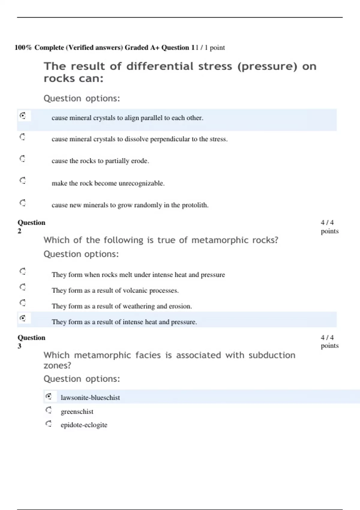 100% Complete (Verified answers) Graded A+ Question 11 / 1 point The result of differential stress (pressure) on rocks can: Question options: cause mineral crystals to dissolve perpendicular to the stress. cause the rocks to partially erode. make the rock become unrecognizable. cause new minerals to grow randomly in the protolith. Question 2 Which of the following is true of metamorphic rocks? Question options: They form when rocks melt under intense heat and pressure They form as a result of volcanic processes. They form as a result of weathering and erosion. 4 / 4 points Question 3 Which metamorphic facies is associated with subduction zones? Question options: 4 / 4 points greenschist epidote-eclogite They form as a result of intense heat and pressure. lawsonite-blueschist cause mineral crystals to align parallel to each other. granulite View Feedback Question 4 4 / 4 points The parent rock of a metamorphic rock is what? Question options: The rock after it was subjected to metamorphism. Question 5 The first rock formed during metamorphism. The rock as it is subjected to metamorphism. 4 / 4 points What are the textures of metamo