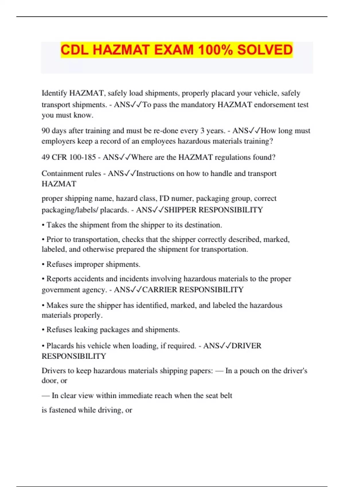 CDL HAZMAT EXAM 100% SOLVED Identify HAZMAT, safely load shipments, properly placard your vehicle, safely transport shipments. - ANSTo pass the mandatory HAZMAT endorsement test you must know. 90 days after training and must be re-done every 3 years. - ANSHow long must employers keep a record of an employees hazardous materials training? 49 CFR 100-185 - ANSWhere are the HAZMAT regulations found? Containment rules - ANSInstructions on how to handle and transport HAZMAT proper shipping name, hazard class, I'D numer, packaging group, correct packaging/labels/ placards. - ANSSHIPPER RESPONSIBILITY • Takes the shipment from the shipper to its destination. • Prior to transportation, checks that the shipper correctly described, marked, labeled, and otherwise prepared the shipment for transportation. • Refuses improper shipments. • Reports accidents and incidents involving hazardous materials to the proper government agency. - ANSCARRI