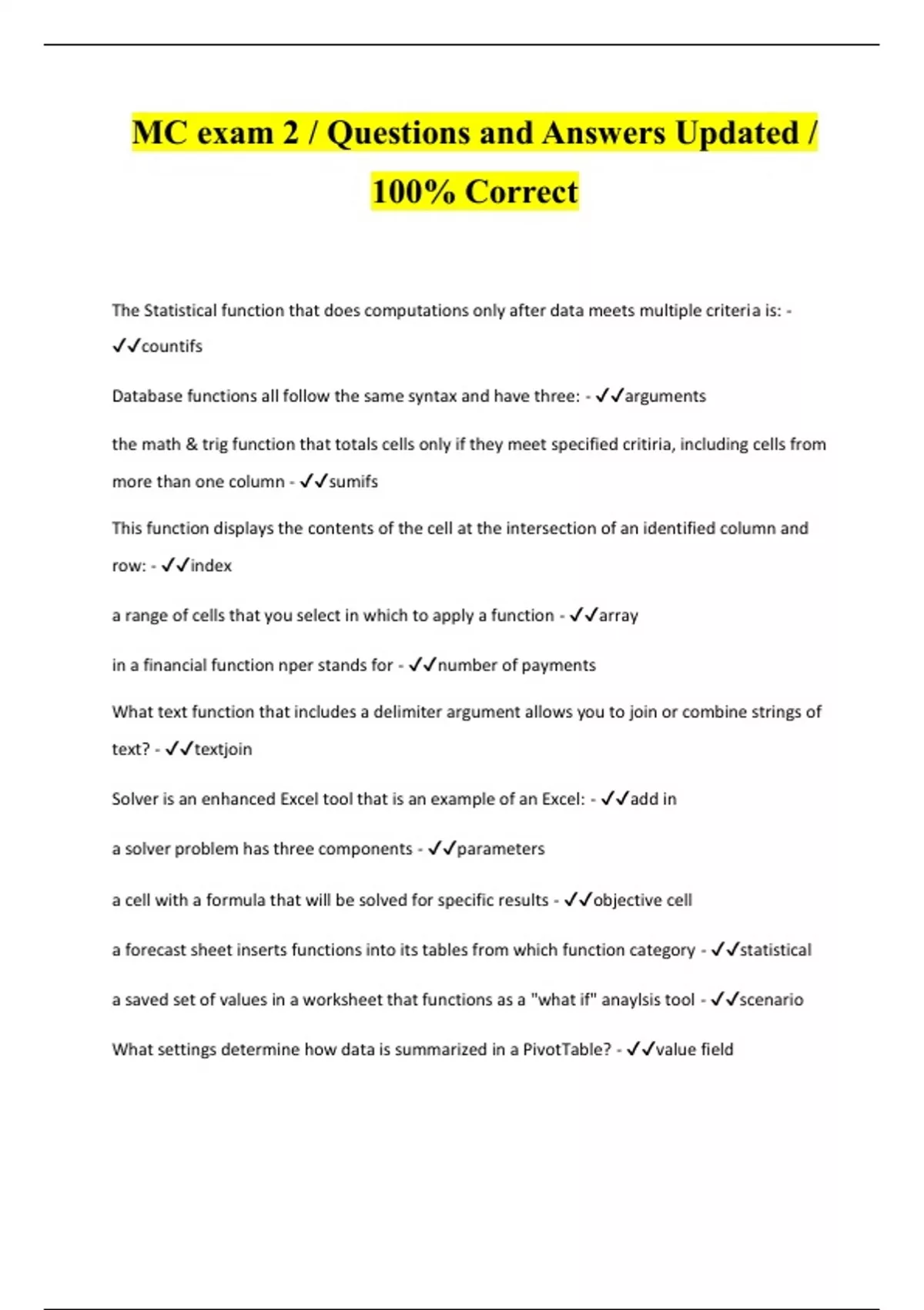 The Statistical function that does computations only after data meets multiple criteria is: - countifs Database functions all follow the same syntax and have three: - arguments the math & trig function that totals cells only if they meet specified critiria, including cells from more than one column - sumifs This function displays the contents of the cell at the intersection of an identified column and row: - index a range of cells that you select in which to apply a function - array in a financial function nper stands for - number of payments What text function that includes a delimiter argument allows you to join or combine strings of text? - textjoin