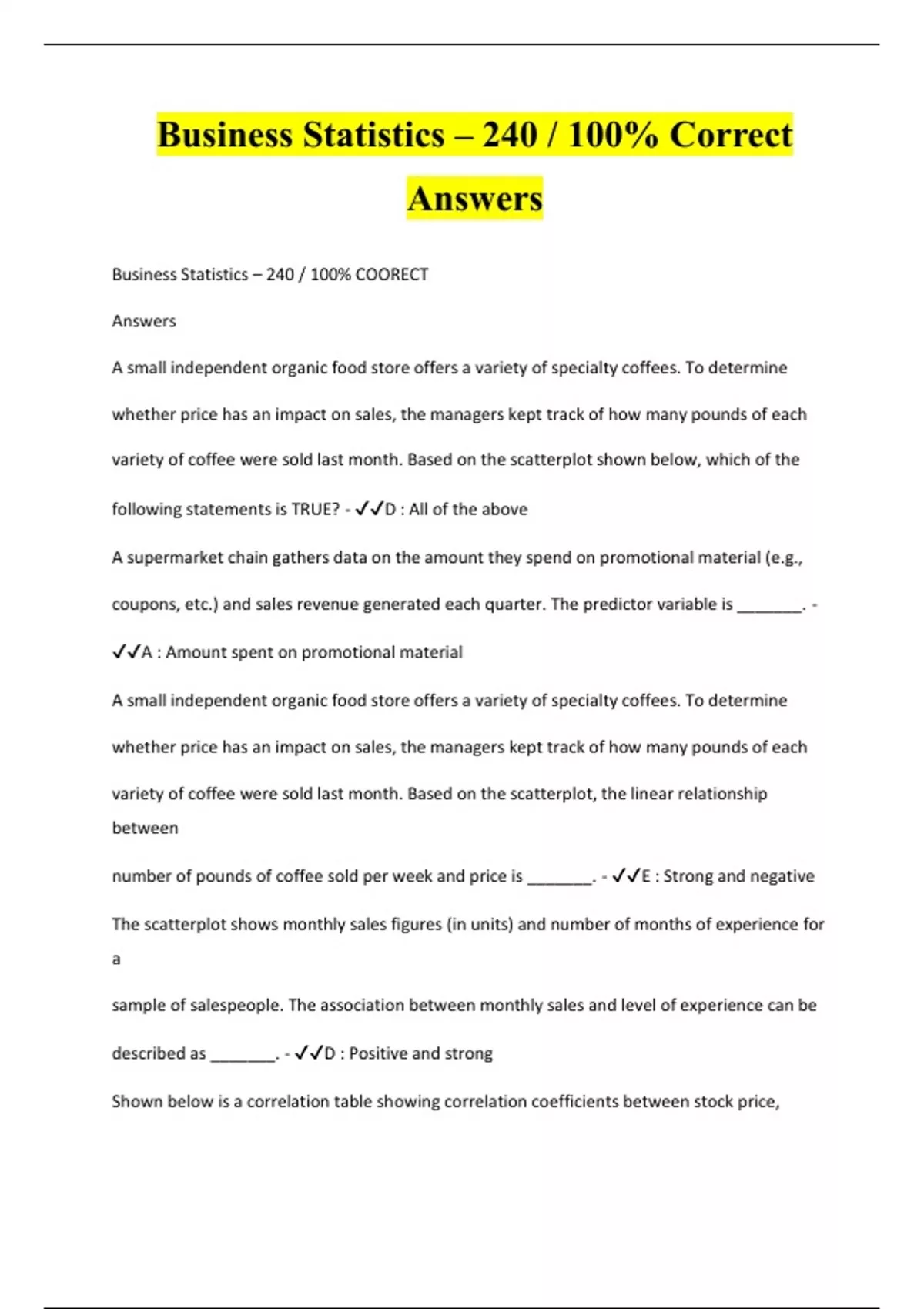 Business Statistics – 240 / 100% COORECT Answers A small independent organic food store offers a variety of specialty coffees. To determine whether price has an impact on sales, the managers kept track of how many pounds of each variety of coffee were sold last month. Based on the scatterplot shown below, which of the following statements is TRUE? - D : All of the above A supermarket chain gathers data on the amount they spend on promotional material (e.g., coupons, etc.) and sales revenue generated each quarter. The predictor variable is _______. - A : Amount spent on promotional material A small independent organic food store offers a variety of specialty coffees. To determine whether price has an impact on sales, the managers kept track of how many pounds of each variety of coffee were sold last month. Based on the scatterplot, the linear relationship between number of pounds of coffee sold per week and price is _______. - E : Strong and negative The scatterplot shows monthly sales figures (in units) and number of months of experience for a sample of salespeople.
