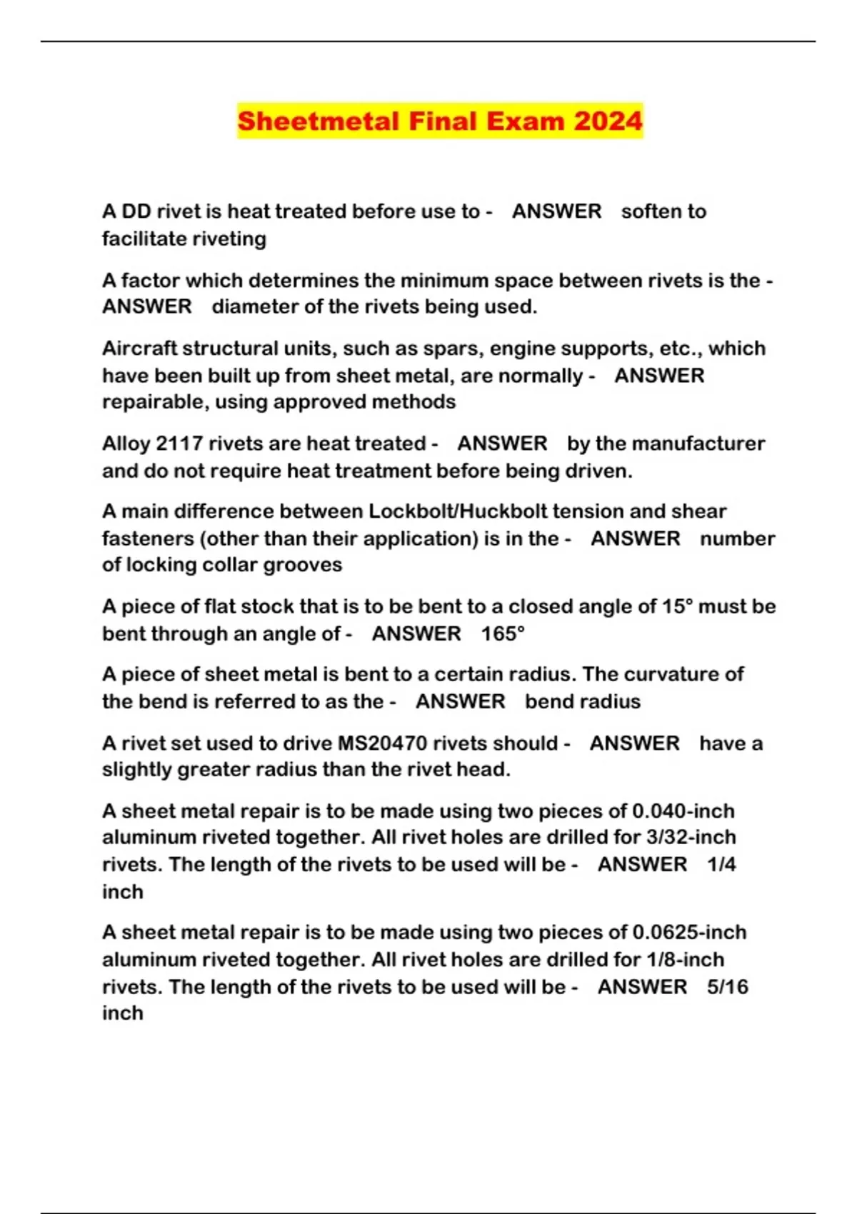 Sheetmetal Final Exam 2024...
