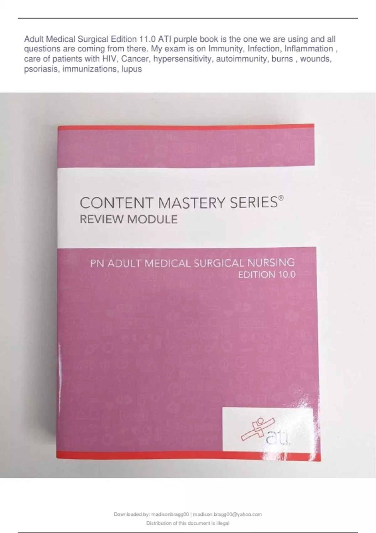 Adult Medical Surgical Edition 11.0 ATI purple book is the one we are using and all questions are coming from there. My exam is on Immunity, Infection, Inflammation , care of patients with HIV, Cancer, hypersensitivity, autoimmunity, burns , wounds, ps