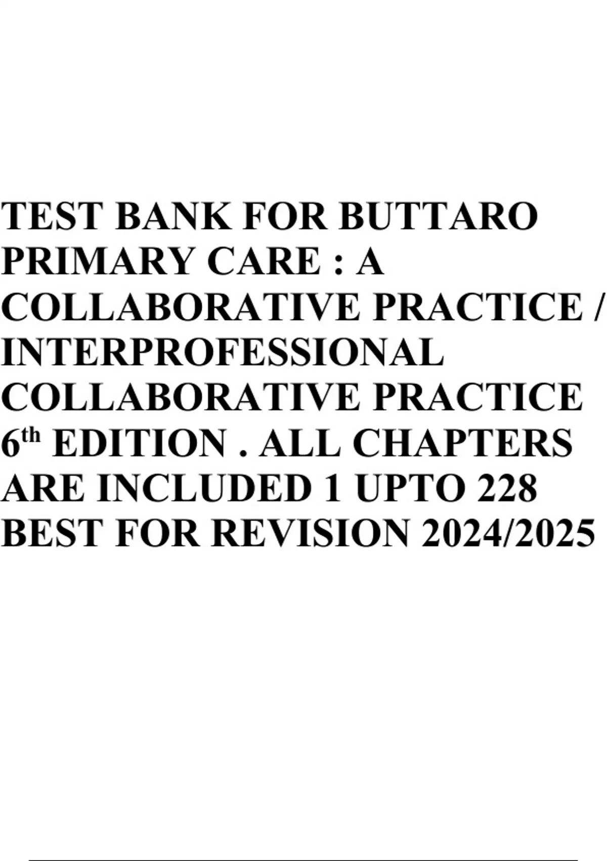 TEST BANK FOR BUTTARO PRIMARY CARE : A COLLABORATIVE PRACTICE / INTERPROFESSIONAL COLLABORATIVE PRACTICE 6 th EDITION . ALL CHAPTERS ARE INCLUDED 1 UPTO 228 BEST FOR REVISION 2024/2025 .
