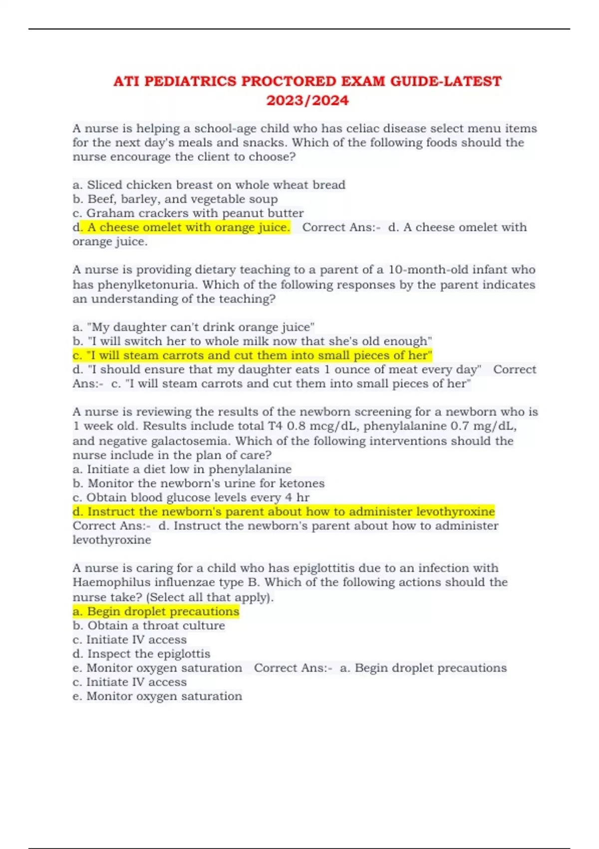 ATI PEDIATRICS PROCTORED EXAM GUIDE-LATEST 2023/2024 A nurse is helping a school-age child who has celiac disease select menu items for the next day's meals and snacks. Which of the following foods should the nurse encourage the client to choose? a. Sliced chicken breast on whole wheat bread b. Beef, barley, and vegetable soup c. Graham crackers with peanut butter d. A cheese omelet with orange juice. Correct Ans:- d. A cheese omelet with orange juice. A nurse is providing dietary teaching to a parent of a 10-month-old infant who has phenylketonuria. Which of the following responses by the parent indicates an understanding of the teaching? a. "My daughter can't drink orange juice" b. "I will switch her to whole milk now that she's old enough" c. "I will steam carrots and cut them into small pieces of her" d. "I should ensure that my daughter eats 1 ounce of meat every day" Correct Ans:- c. "I will steam carrots and cut them into small pieces of her" A nurse is reviewing the results of the newborn screening for a newborn who is 1 week old. Results include total T4 0.8 mcg/dL, phenylalanine 0.7 mg/dL, and negative galactosemia. Which of the following interventions should the nurse include in the plan of care? a. Initiate a diet low in phenylalanine b. Monitor the newborn's urine for ketones c. Obtain blood glucose levels every 4 hr d. Instruct the newborn's parent about how to administer levothyroxine Correct Ans:- d. Instruct the newborn's parent about how to administer levothyroxine A nurse is caring for a child who has epiglottitis due to an infection with Haemophilus influenzae type B. Which of the following actions should the nurse take? (Select all that apply). a. Begin droplet precautions b. Obtain a throat culture c. Initiate IV access d. Inspect the epiglottis e. Monitor oxygen saturation Correct Ans:- a. Begin droplet precautions c. Initiate IV access e. Monitor oxygen saturation A nurse is planning care for an 8-month-old infant who has bronchiolitis. Which of the following actions should the nurse include in the plan of care? a. Administer a meningococcal vaccine upon admission b. Use a bulb syringe to suction the nares c. Place the infant in a room with negative-pressure airflow d. Initiate IV antibiotic therapy Correct Ans:- b. Use a bulb syringe to suction the nares A nurse is providing discharge teaching to the parents of a preschool aged child who has heart-failure and a new prescription for digoxin oral solution. Which of the following instructions should the nurse include? a. "If a dose is missed, double the next dose" b. "If your child vomits, do not give the medication for 48 hours" c. "Mix the medication with 6 ounces of your child's favorite juice" d. "Rinse your child's mouth with water after giving the medication" Correct Ans:- d. "Rinse your child's mouth with water after giving the medication" A nurse is assessing a 24-month-old toddler. Which of the following findings should the nurse report to the provider? a. Has a vocabulary of 30 words b. Eats a large amount of food one day then very little the next c. Sleeps 11 to 12 hr per day d. Hold his breath when having a temper tantrum Correct Ans:- a. Has a vocabulary of 30 words A nurse is assessing a child who is 2 hr postoperative following cardiac catheterization and finds the dressing is saturated with blood. Which of the following actions should the nurse take first? a. Administer acetaminophen b. Monitor pulse distal to the insertion site c. Check the child's blood glucose level d. Apply pressure just above the insertion site Correct Ans:- d. Apply pressure just above the insertion site A nurse is planning to teach an adolescent who is lactose intolerant about dietary guidelines. Which of the following instructions should the nurse include in the teaching? a. "You should consume flavored yogurt instead of plain yogurt" b. "You can drink milk on an empty stomach" c. "You may tolerate plain milk better than chocolate milk" d. "You can replace milk with non-dairy sources of calcium" Correct Ans:- d. "You can replace milk with non-dairy sources of calcium" A nurse is collecting data from a toddler who weighs 20 kg (44 lb) and has a full-thickness burn to 10% of this body. Which of the following findings should the nurse report to the provider? a. Increased restlessness b. Respiratory rate 25/min c. Bowel sounds 20/min d. Urinary output 35 mL/hr Correct Ans:- a. Increased restlessness A nurse is assessing a preschool-age child who is in the immediate postoperative period following a tonsillectomy. Which of the following assessment findings is the priority? a. The child's throat pain increases b. The child swallows frequently c. The child refuses clear liquids d. The child cries often Correct Ans:- b. The child swallows frequently A nurse is providing teaching to a parent of an 11-month-old infant who has acute diarrhea and dehydration. Which of the following fluids should the nurse instruct the parent to provide to the infant? a. Oral electrolyte solution b. Half-strength apple juice c. Chicken broth d. Glucose water Correct Ans:- a. Oral electrolyte solution A nurse in an emergency department is caring for a child who experienced a submersion injury. Which of the following is the priority action for the nurse to take? a. Assist with intubation b. Obtain an ABG sample c. Administer an IV bolus d. Apply warming blankets Correct Ans:- a. Assist with intubation A nurse is reviewing the medical record of a 6-month-old infant who has heart failure prior to administering medications. The nurse should recognize that which of the following medications is contraindicated? (Click on the "EXHIBIT" a. NOT ENOUGH INFO. Correct Ans:- A nurse is caring for a school-age child who is in 90 degree/90 degree skeletal traction. Which of the following actions should the nurse take? a. Release the traction to allow the child to bathe b. Ensure that the pulley mechanism is attached to the skin c. Adjust the weights to allow the child to 