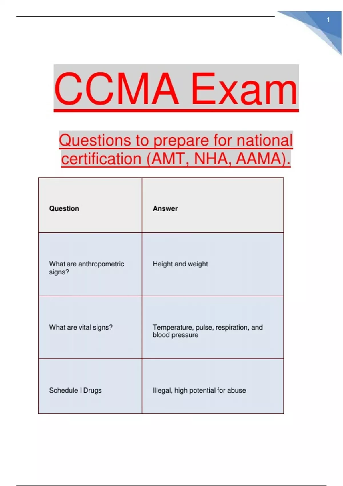 CCMA Exam Questions to prepare for national certification (AMT, NHA, AAM