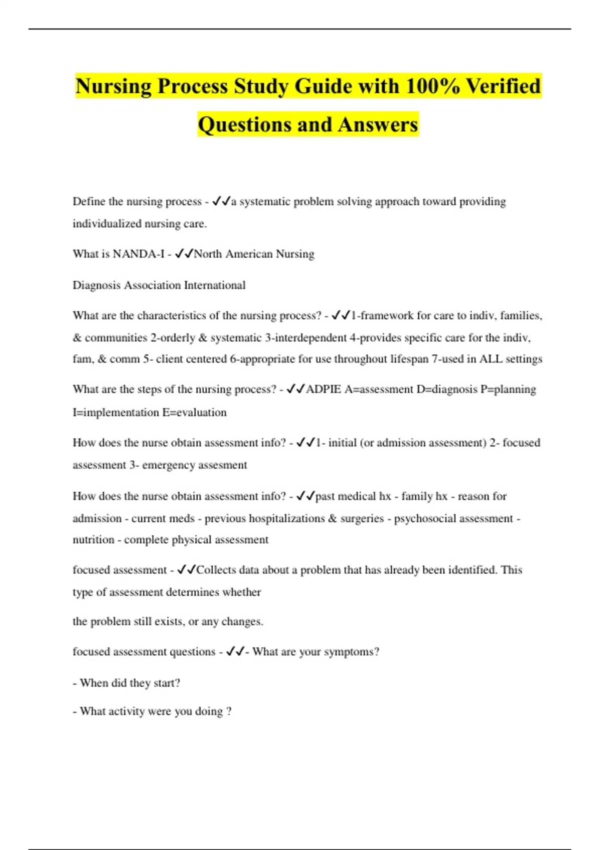 Nursing Process Study Guide with 100% Verified Questions and Answers