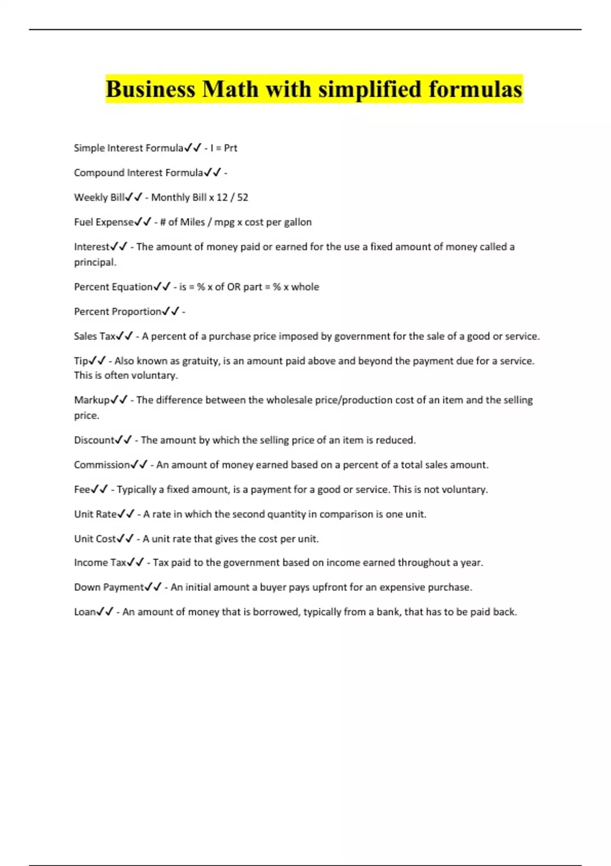 Simple Interest Formula - I = Prt Compound Interest Formula - Weekly Bill - Monthly Bill x 12 / 52 Fuel Expense - # of Miles / mpg x cost per gallon Interest - The amount of money paid or earned for the use a fixed amount of money called a principal. Percent Equation - is = % x of OR part = % x whole Percent Proportion - Sales Tax - A percent of a purchase price imposed by government for the sale of a good or service. Tip - Also known as gratuity, is an amount paid above and beyond the payment due for a service. This is often voluntary. Markup - The difference between the wholesale price/production cost of an item and the selling price.