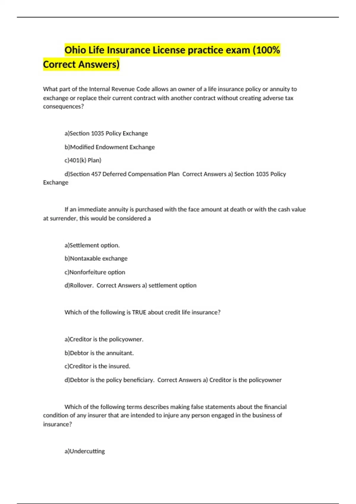 What part of the Internal Revenue Code allows an owner of a life insurance policy or annuity to exchange or replace their current contract with another contract without creating adverse tax consequences? a)Section 1035 Policy Exchange b)Modified Endowment Exchange c)401(k) Plan) d)Section 457 Deferred Compensation Plan Correct Answers a) Section 1035 Policy Exchange If an immediate annuity is purchased with the face amount at death or with the cash value at surrender, this would be considered a a)Settlement option. b)Nontaxable exchange c)Nonforfeiture option d)Rollover. Correct Answers a) settlement option Which of the following is TRUE about credit life insurance? a)Creditor is the policyowner. b)Debtor is the annuitant. c)Creditor is the insured. d)Debtor is the policy beneficiary. Correct Answers a) Creditor is the policyowner Which of the following terms describes making false statements about the financial condition of any insurer that are intended to injure any person engaged in the business of insurance? a)Undercutting