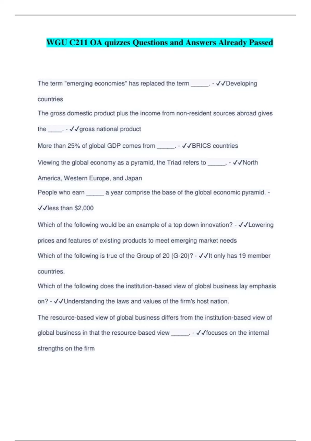 The term "emerging economies" has replaced the term _____. - ️️Developing countries The gross domestic product plus the income from non-resident sources abroad gives the ____. - ️️gross national product More than 25% of global GDP comes from _____. - ️️BRICS countries Viewing the global economy as a pyramid, the Triad refers to _____. - ️️North America, Western Europe, and Japan People who earn _____ a year comprise the base of the global economic pyramid. - ️️less than $2,000 Which of the following would be an example of a top down innovation? - ️️Lowering prices and features of existing products to meet emerging market needs Which of the following is true of the Group of 20 (G-20)? - ️️It only has 19 member countries. Which of the following does the institution-based view of global business lay emphasis on? - ️️Understanding the laws and values of the firm's host nation. The resource-based view of global business differs from the institution-based view of global business in that the resource-based view _____. - ️️focuses on the internal strengths on the firm