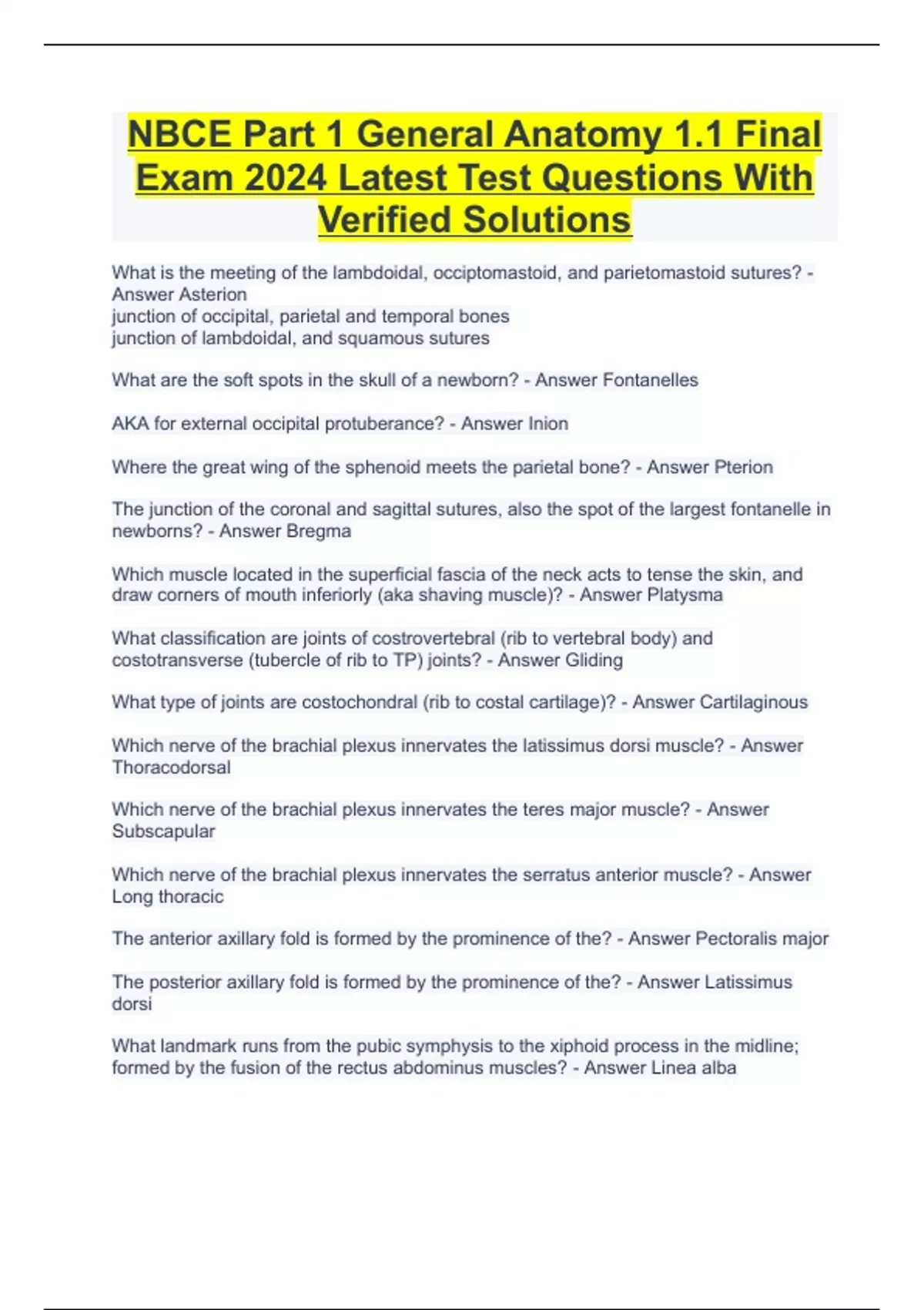 NBCE Part 1 General Anatomy 1.1 Final Exam 2024 Latest Test Questions With Verified Solutions