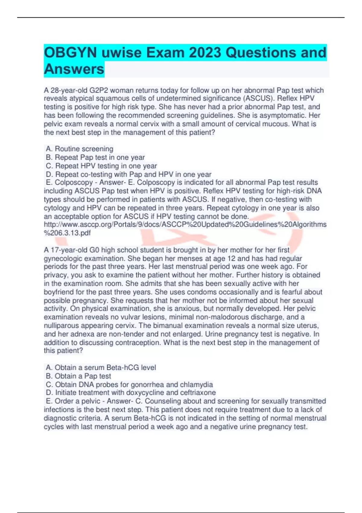 OBGYN uwise Exam 2023 Questions and Answers A 28-year-old G2P2 woman returns today for follow up on her abnormal Pap test which reveals atypical squamous cells of undetermined significance (ASCUS). Reflex HPV testing is positive for high risk type. She has never had a prior abnormal Pap test, and has been following the recommended screening guidelines. She is asymptomatic. Her pelvic exam reveals a normal cervix with a small amount of cervical mucous. What is the next best step in the management of this patient? A. Routine screening B. Repeat Pap test in one year C. Repeat HPV testing in one year D. Repeat co-testing with Pap and HPV in one year E. Colposcopy - Answer- E. Colposcopy is indicated for all abnormal Pap test results including ASCUS Pap test when HPV is positive. Reflex HPV testing for high-risk DNA types should be performed in patients with ASCUS. If negative, then co-testing with cytology and HPV can be repeated in three years. Repeat cytology in one year is also an acceptable option for ASCUS if HPV testing cannot be done. % A 17-year-old G0 high school student is brought in by her mother for her first