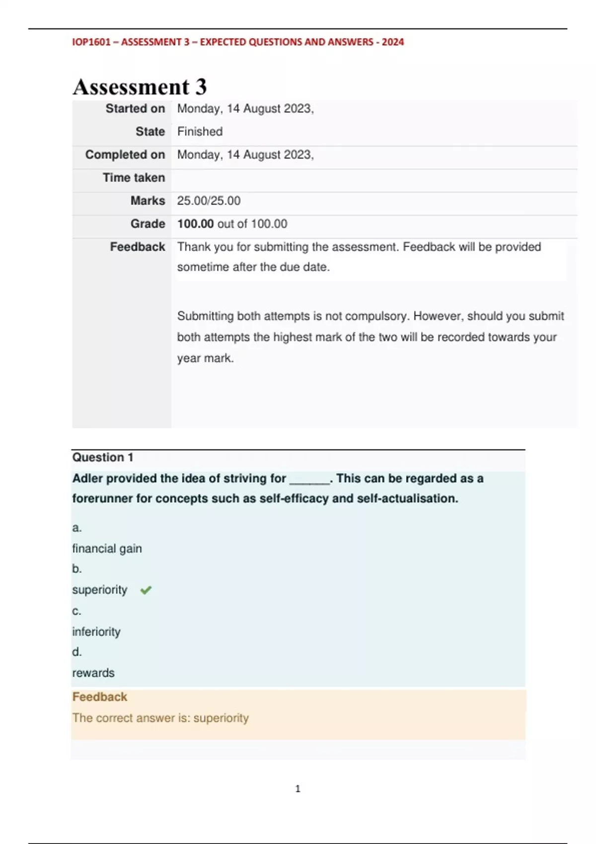 , IOP1601 – ASSESSMENT 3 – EXPECTED QUESTIONS AND ANSWERS - 2024