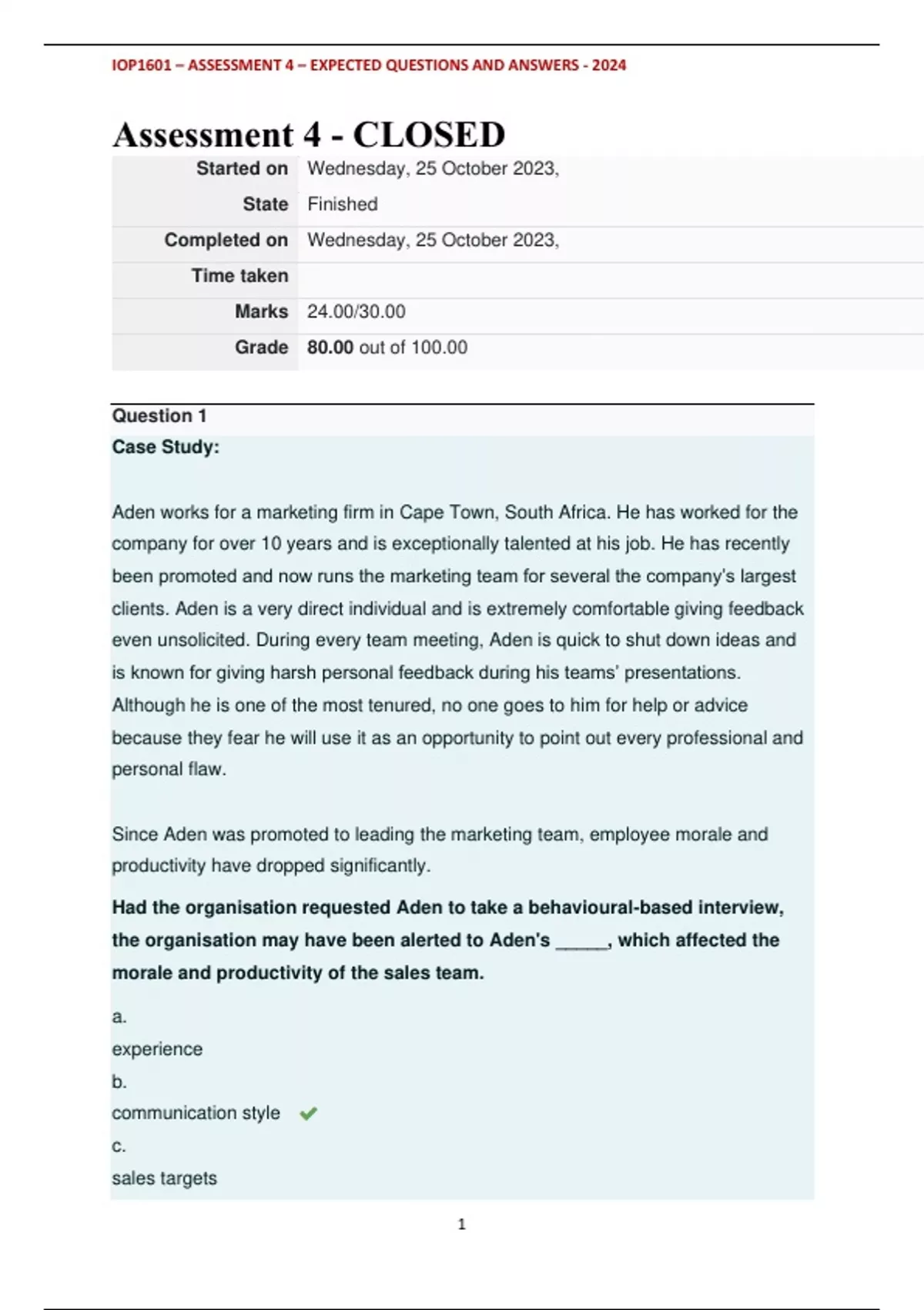 IOP1601 - ASSESSMENT 4 - EXPECTED QUESTIONS AND ANSWERS - 2024
