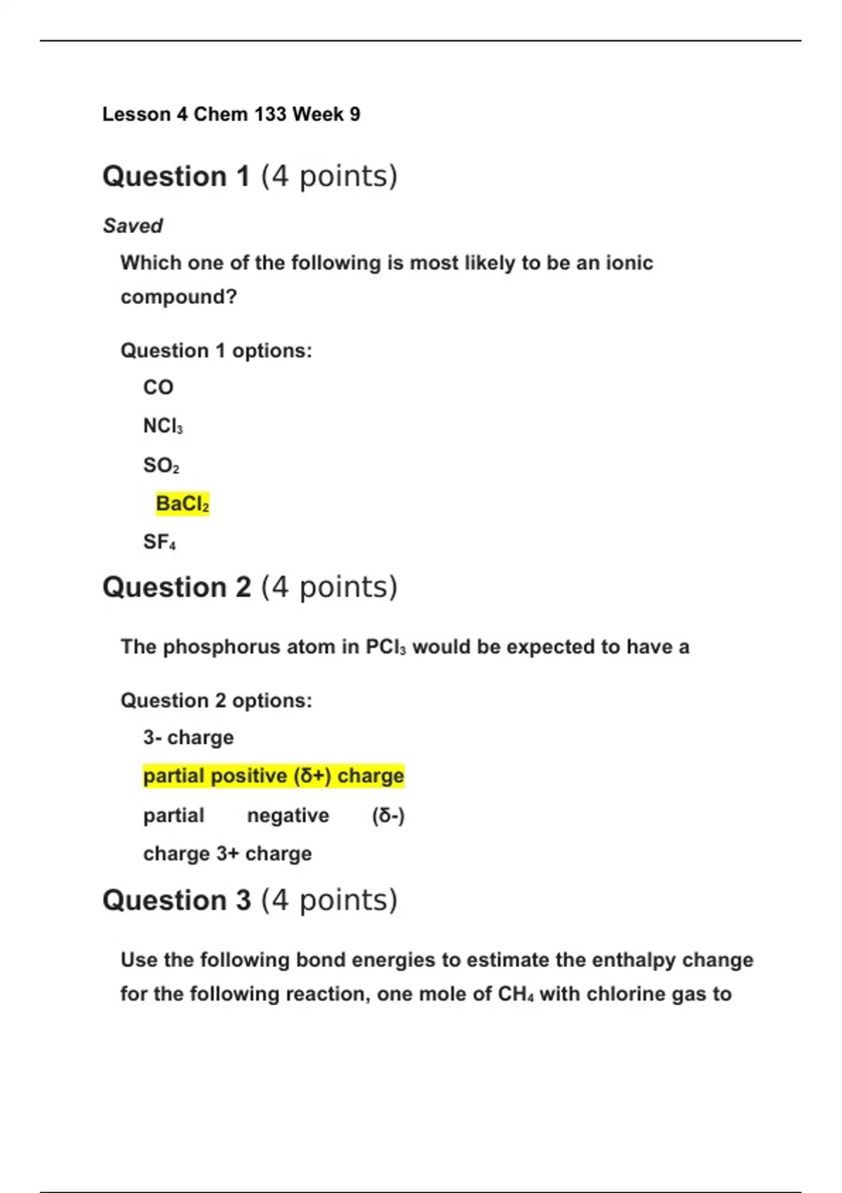1. Question: Which one of the following is most likely to be an ionic compound? 2. Question: The phosphorus atom in PCl3 would be expected to have a 3. Question: The phosphorus atom in PCl3 would be expected to have a give CH3Cl and hydrogen chloride. 4. Question: How many of the following molecules have no dipole moment? 5. Question: Atoms having equal or nearly equal electronegativities are expected to form 6. Question: Element A has an electronegativity of 0.8 and element B has an electronegativity of 3.0. Which statement best describes the bonding in A3B? 7. Question: Of the following elements, which has the highest electronegativity? 8. Question: In which case is the bond polarity incorrect? 9. Question: Calculate the Lattice Energy of KCl(s) given the following data using the Born-Haber cycle: 10. Question: A chlorine atom in Cl2 should have a. 11. Question: Which one of the following is most likely to be a covalent compound? 12. Question: Which is the longest bond? 13. Question: The compound IF5 contains 14. Question: Draw the Lewis structure for SO42-. How many equivalent resonance structures can be drawn? 15. Question: Identify the correct statement. 16. Question: The compound ICl contains 17. Question: Which of the following represent the Lewis structure for N? 18. Question: In the Lewis structure for BeCl2 , what is the formal charge on the Be atom? 19. Question: Which of the following contains an atom that does not obey the octet rule? 20. Question: How many lone pairs of electrons are on the Br atom in BrF5? 21. Question: Which ionic compound would be expected to have the highest lattice energy? 22. Question: How many lone pairs of electrons are on the I atom in IF4+? 23. Question: In the Lewis structure of CH3OH, how many lone pairs of electrons are there? 24. Question: Use the bond energies provided to estimate ΔH°rxn for the reaction below: 25. Question: The arsenic atom in AsCl3 would be expected to have a
