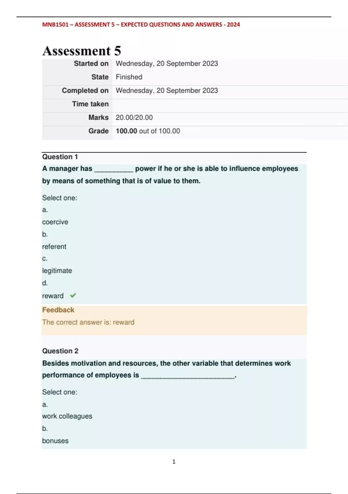 MNB1501 - ASSESSMENT 5 - EXPECTED QUESTIONS AND ANSWERS - 2024