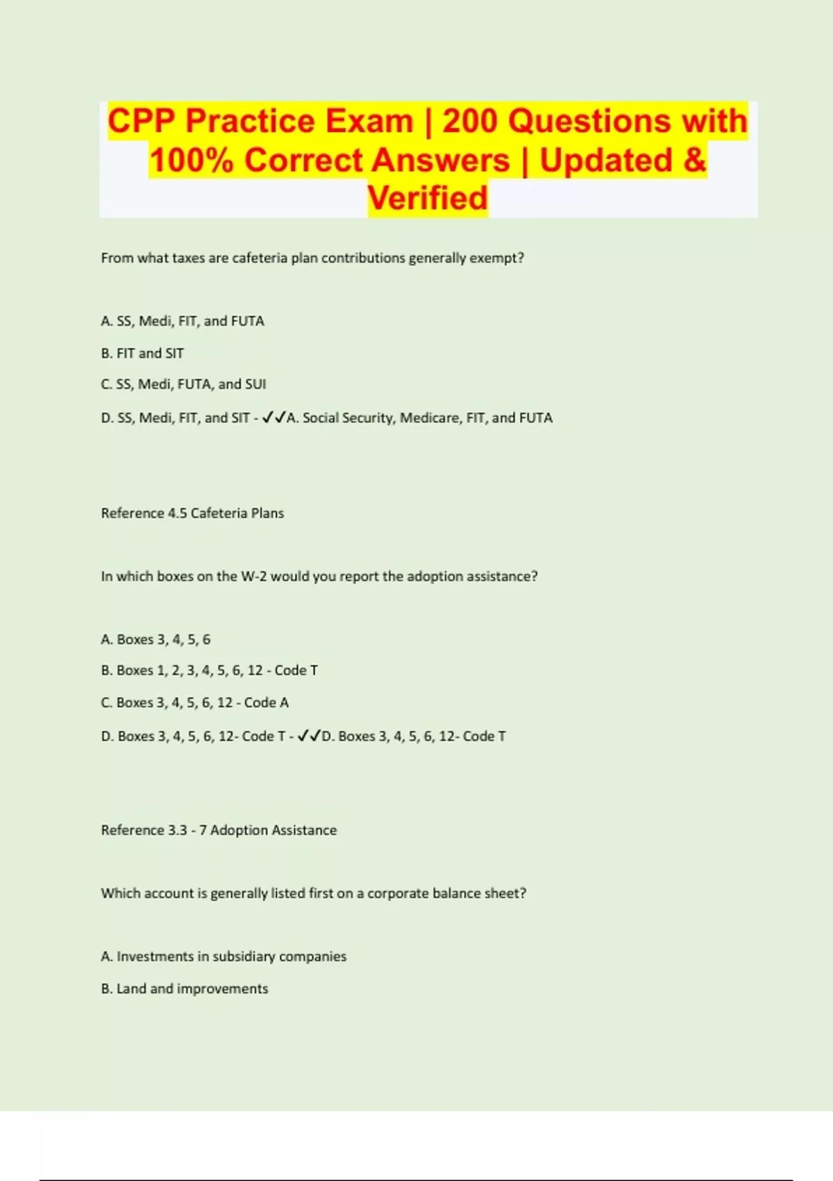 From what taxes are cafeteria plan contributions generally exempt? A. SS, Medi, FIT, and FUTA B. FIT and SIT C. SS, Medi, FUTA, and SUI D. SS, Medi, FIT, and SIT - A. Social Security, Medicare, FIT, and FUTA Reference 4.5 Cafeteria Plans In which boxes on the W-2 would you report the adoption assistance? A. Boxes 3, 4, 5, 6 B. Boxes 1, 2, 3, 4, 5, 6, 12 - Code T C. Boxes 3, 4, 5, 6, 12 - Code A D. Boxes 3, 4, 5, 6, 12- Code T - D. Boxes 3, 4, 5, 6, 12- Code T Reference 3.3 - 7 Adoption Assistance Which account is generally listed first on a corporate balance sheet? A. Investments in subsidiary companies B. Land and improvements C. Prepaid expenses D. Buildings and other property - C. Prepaid expenses