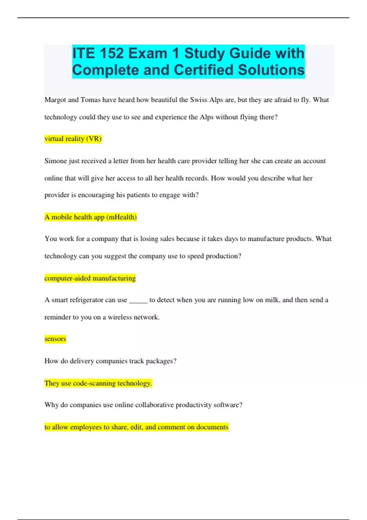 ITE 152 Exam 1 Study Guide with Complete and Certified Solutions Margot and Tomas have heard how beautiful the Swiss Alps are, but they are afraid to fly. What technology could they use to see and experience the Alps without flying there? virtual reality (VR) Simone just received a letter from her health care provider telling her she can create an account online that will give her access to all her health records. How would you describe what her provider is encouraging his patients to engage with? A mobile health app (mHealth) You work for a company that is losing sales because it takes days to manufacture products. What technology can you suggest the company use to speed production? computer-aided manufacturing A smart refrigerator can use _____ to detect when you are running low on milk, and then send a reminder to you on a wireless network. sensors How do delivery companies track packages? They use code-scanning technology. Why do companies use online collaborative productivity software? to allow employees to share, edit, and comment on documents How would you describe an intelligent workplace? It uses technology to enable workers to connect and communicate. Which company was the first to develop a computer meant for personal use? Apple The Americans with Disabilities Act (ADA) requires that public schools purchase or acquire funding for adaptive technologies. False You can avoid electronic waste by replacing devi