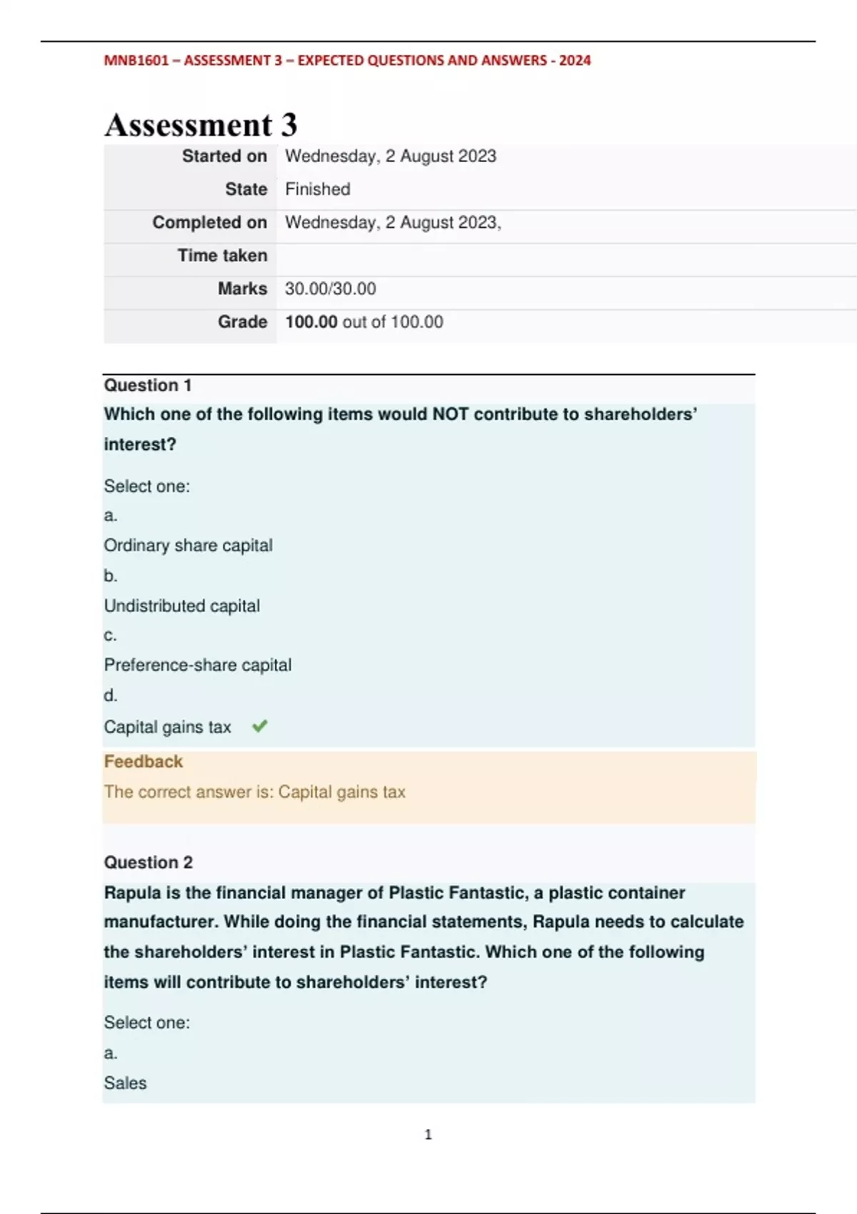 MNB1601 – ASSESSMENT 3 – EXPECTED QUESTIONS AND ANSWERS - 2024