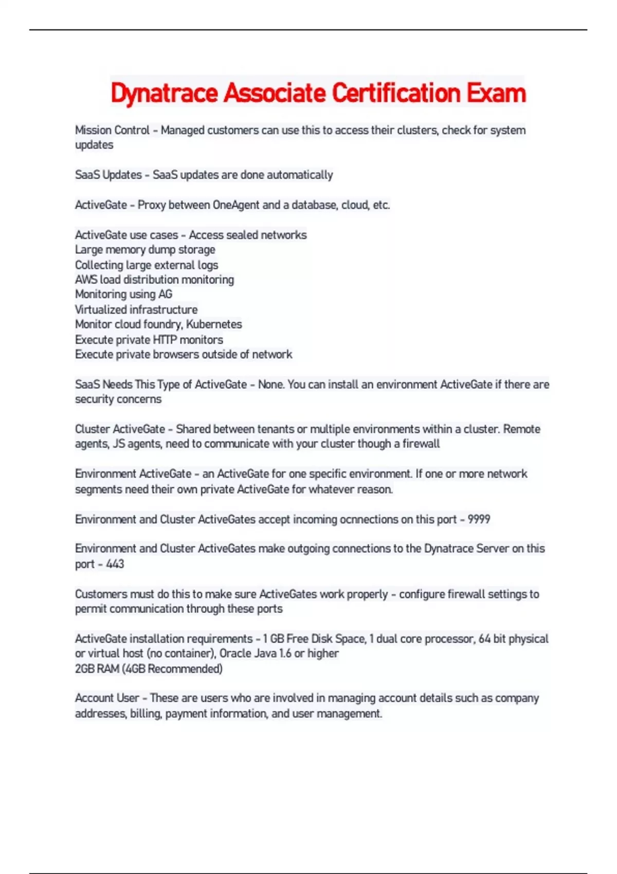 Mission Control - ANSWER-Managed customers can use this to access their clusters, check for system updates SaaS Updates - ANSWER-SaaS updates are done automatically ActiveGate - ANSWER-Proxy between OneAgent and a database, cloud, etc. ActiveGate use cases - ANSWER-Access sealed networks Large memory dump storage Collecting large external logs AWS load distribution monitoring Monitoring using AG Virtualized infrastructure Monitor cloud foundry, Kubernetes Execute private HTTP monitors Execute private browsers outside of network SaaS Needs This Type of ActiveGate - ANSWER-None. You can install an environment ActiveGate if there are security concerns Cluster ActiveGate - ANSWER-Shared between tenants or multiple environments within a cluster. Remote agents, JS agents, need to communicate with your cluster though a firewall Environment ActiveGate - ANSWER-an ActiveGate for one specific environment. If one or more network segments need their own private ActiveGate for whatever reason. Environment and Cluster ActiveGates accept incoming ocnnections on this port - ANSWER-9999 Environment and Cluster ActiveGates make outgoing connections to the Dynatrace Server on this port - ANSWER-443 Customers must do this to make sure ActiveGates work properly - ANSWER-configure firewall settings to permit communication through these ports ActiveGate installation requirements - ANSWER-1 GB Free Disk Space, 1 dual core processor, 64 bit physical or virtual host (no container), Oracle Java 1.6 or higher 2GB RAM (4GB Recommended) Account User - ANSWER-These are users who are involved in managing account details such as company addresses, billing, payment information, and user management. Account Users - types of user permission groups - ANSWER-Account Manager, Finance Administrator, Account Viewer: Support Environment User - ANSWER-These are users who work with Dynatrace to monitor the health of the hosts, services, and infrastructure in their application environments. Environment Users - types of user permission groups - ANSWER-Monitoring administrator, confidential data administrtor, deployment administrator, monitoring viewer, log viewer Account Viewer - ANSWER-has access to environment consumption data, Help, and Support. No access to credit card data, invoices, or company/billing address info. Can't edit groups or assign users to groups. Financial Admin - ANSWER-can enter credit card data and review invoices. Has access to environment consumption data, Help, and Support. Can't edit groups or assign users to groups. No access to company/billing address info. Account Manager - ANSWER-has full account access. Can view and edit company data, enter credit card data, review invoices, create and edit groups, and add users to groups. Also has access to environment consumption data, Help, and Support. Monitoring Admin - ANSWER-has full environment access. Can change monitoring settings. Can download and install OneAgent. Deployment Admin - ANSWER-can download and install OneAgent. Has read-only access to the environment. Can't change settings. Confidential data admin - ANSWER-can view personal data (for example, method arguments) and configure request-data capture rules. Monitoring Viewer - ANSWER-can access the environment in read-only mode. Can't change settings. Can't download or install OneAgent. Log Viewer - ANSWER-can access and view the contents of log files. Reserved for users who need access to sensitive log file data. No other access rights. Must have the following to deploy OneAgent - ANSWER-Dynatrace login, Server Admin rights, Permissions to restart services, firewall admin rights, disk space requirements, any necessary ActiveGates installed Process Groups - ANSWER-a logical cluster of processes that belong to the same application or deployment unit and perform the same function across multiple hosts Clustered Services - ANSWER-Same service in multiple processes - SAME process group Separate Services - ANSWER-Same service in multiple processes - MULTIPLE process groups Merged Services - ANSWER-Services in the same process group, with the same technology, but may exist across separate nodes Opaque Services - ANSWER-Cannot be monitored but can be detected by requests made by other services Key Requests - ANSWER-You can measure mission-critical requests or functionality, based on certain text or information or header in a request. You can have custom alerting thresholds Request Attributes - ANSWER-You can define certain request attributes to allow for filtering, sorting, and searching in the Dynatrace dashboard. Tagging and Alerting - ANSWER-You can do manual or automatic tagging. Automatic is better for larger environments Davis AI Event Categories in Descending order - ANSWER-Availability Error Slowdown Resource Custom Alerts Information Only Events (no alarms) Optional Dynatrace Components - ANSWER-ActiveGate Amazon Web Services Synthetic Checks PaaS integrations PaaS: Platforms as a Service VMware Monitoring Agentless RUM Mobile Monitoring Synthetic Monitors - ANSWER-Monitoromplex clickpaths Used to improve monitoring Can be filtered by status, type, profile, locations and application Tells you milliseconds of downtime Provides root cause analysis display with problems What can you use to define a custom service entry point? - ANSWER-Methods, class or interfaces as an entry point. What is required for a browser clickpath monitor? - ANSWER-1. Chrome 2. The Dynatrace Extension 3. Allowing the Dynatrace extension in incognito mode After how much time are automated baselines available to the end user? - ANSWER-Baseline cube is calculated 2 hours after the app or service is initially detected. Automated Baselining - ANSWER-attempts to figure out the best reference values for incoming apps and service traffic. Dynatrace AI learns service response times, error rates and traffic. Which feature allows you to select a period of time across all views? - ANSWER-Timeframe selector Smartscape - ANSWER-visualizes y
