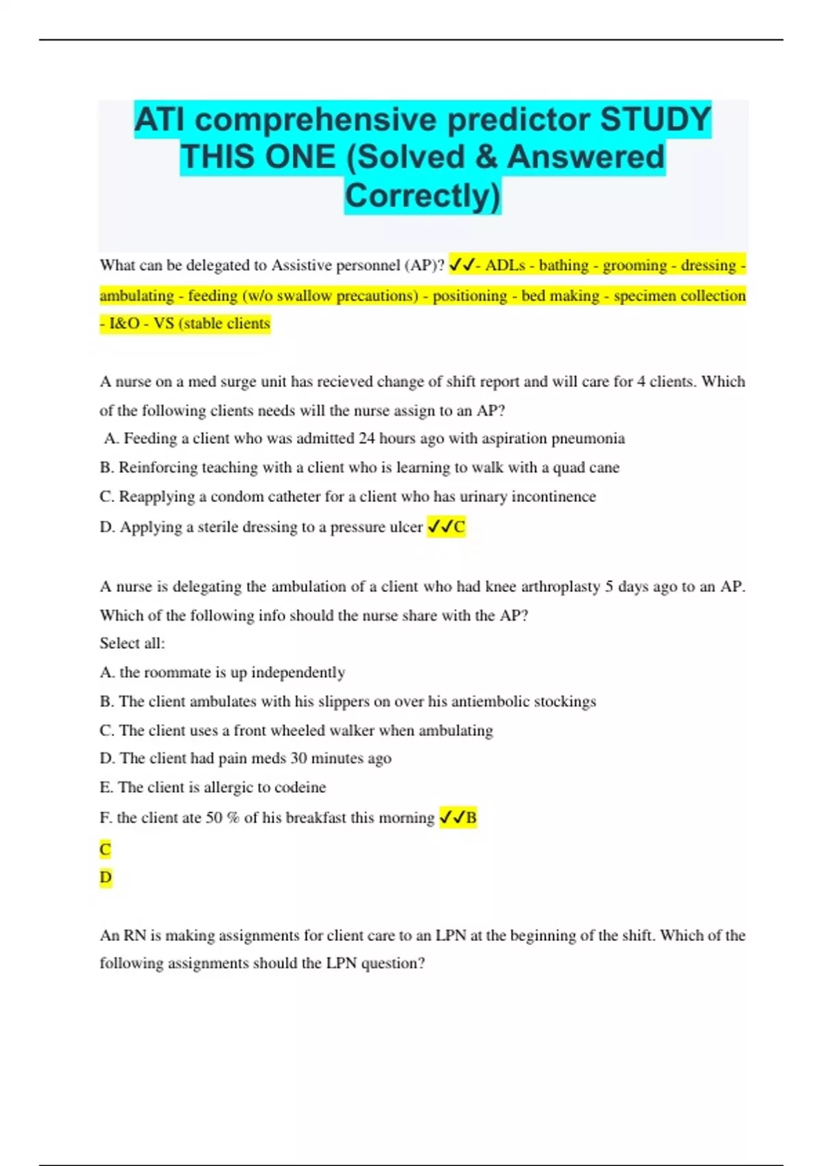 ATI comprehensive predictor STUDY THIS ONE (Solved & Answered Correctly)