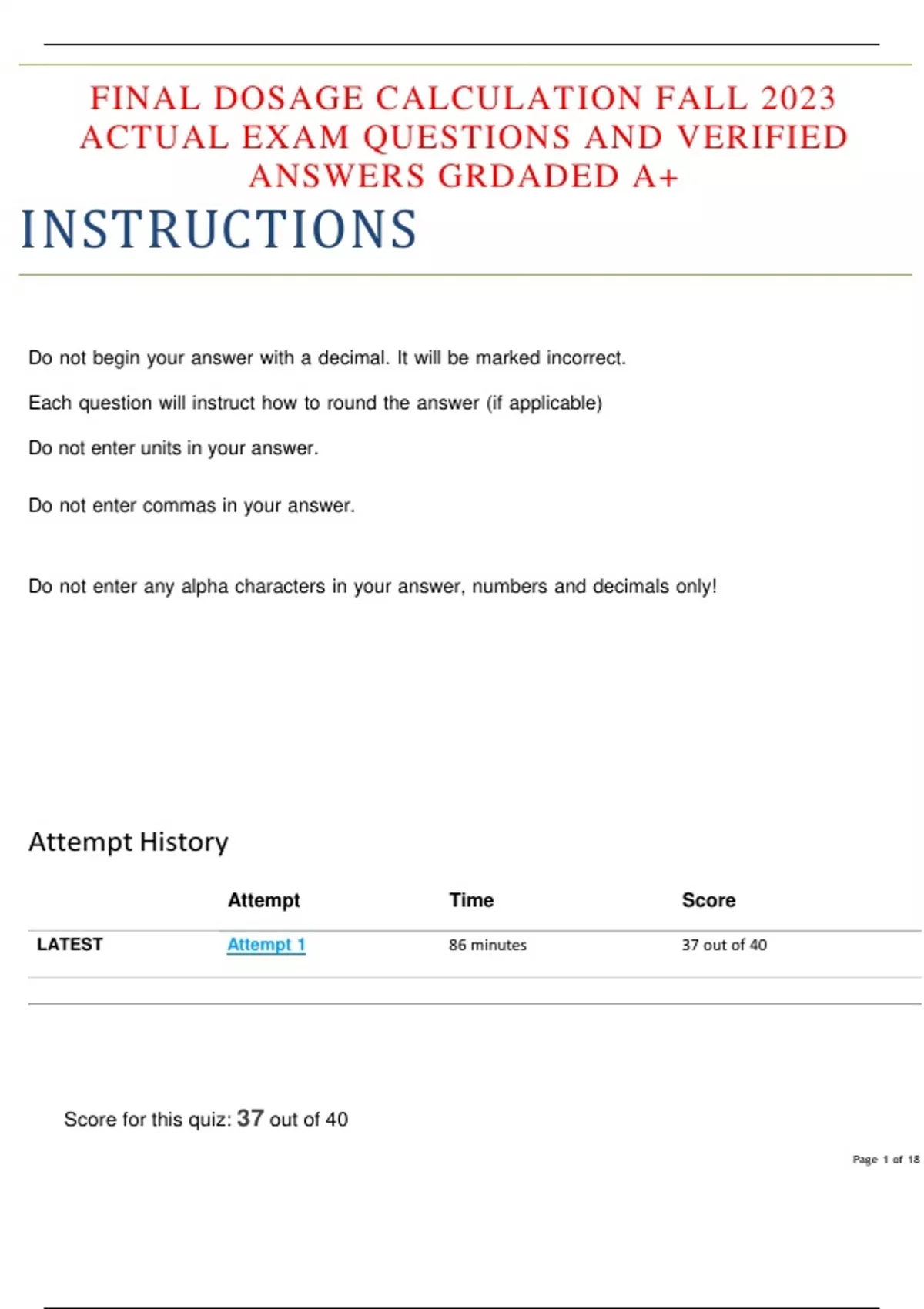 FINAL DOSAGE CALCULATION FALL 2023 ACTUAL EXAM QUESTIONS AND VERIFIED ANSWERS GRDADED A+