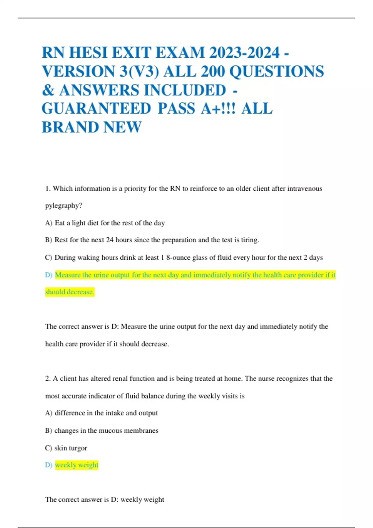 RN HESI EXIT EXAM - VERSION 3 (V3) ALL 200 QUESTIONS & ANSWERS INCLUDED - GUARANTEED PASS A+!!! ALL BRAND NEW RN HESI EXIT EXAM - VERSION 3 (V3) ALL 200 QUESTIONS & ANSWERS INCLUDED - GUARANTEED PASS A+!!! ALL BRAND NEW RN HESI EXIT EXAM - VERSION 3 (V3) ALL 200 QUESTIONS & ANSWERS INCLUDED - GUARANTEED PASS A+!!! ALL BRAND NEW