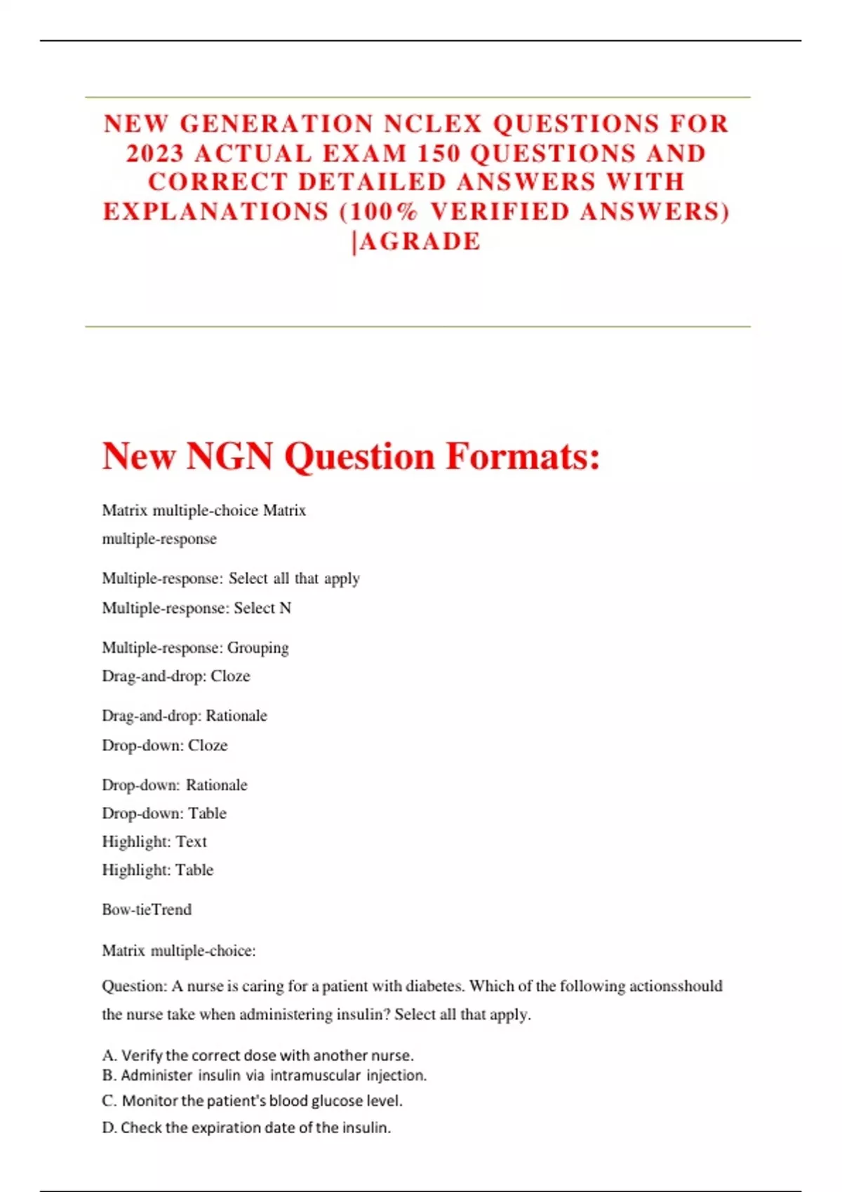 NEW GENERATION NCLEX QUESTIONS FOR 2023 ACTUAL EXAM 150 QUESTIONS AND CORRECT DETAILED ANSWERS WITH EXPLANATIONS (100% VERIFIED ANSWERS) |AGRADE