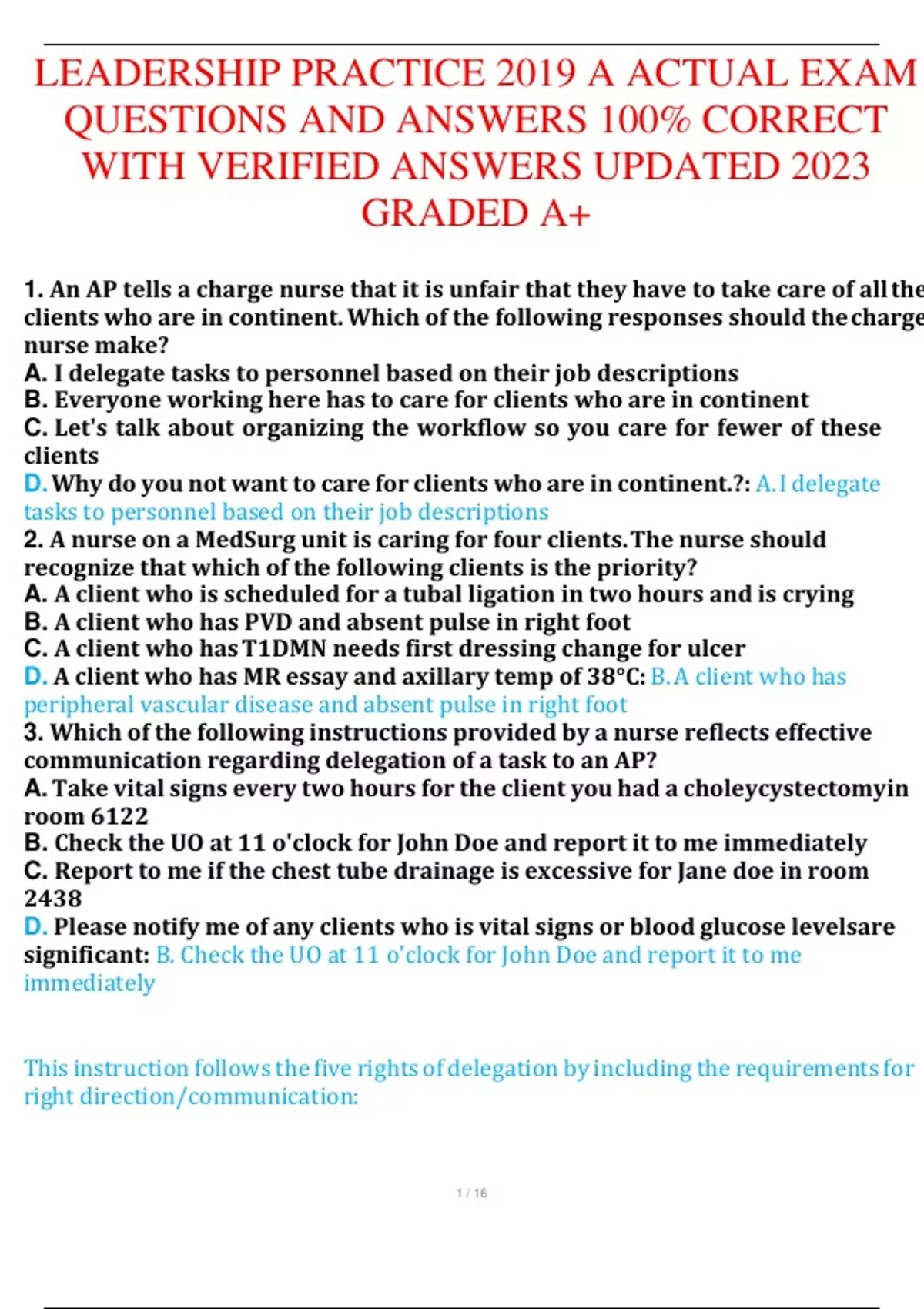 LEADERSHIP PRACTICE 2019 A ACTUAL EXAM QUESTIONS AND ANSWERS 100% CORRECT WITH VERIFIED ANSWERS UPDATED 2023 GRADED A+ LEADERSHIP PRACTICE 2019 A ACTUAL EXAM QUESTIONS AND ANSWERS 100% CORRECT WITH VERIFIED ANSWERS UPDATED 2023 GRADED A+ LEADERSHIP PRACTICE 2019 A ACTUAL EXAM QUESTIONS AND ANSWERS 100% CORRECT WITH VERIFIED ANSWERS UPDATED 2023 GRADED A+ LEADERSHIP PRACTICE 2019 A ACTUAL EXAM QUESTIONS AND ANSWERS 100% CORRECT WITH VERIFIED ANSWERS UPDATED 2023 GRADED A+
