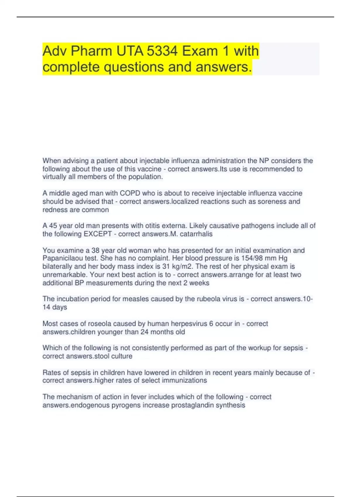 Adv Pharm UTA 5334 Exam 1 with complete questions and answers. When advising a patient about injectable influenza administration the NP considers the following about the use of this vaccine - correct answers.Its use is recommended to virtually all members of the population. A middle aged man with COPD who is about to receive injectable influenza vaccine should be advised that - correct ized reactions such as soreness and redness are common A 45 year old man presents with otitis externa. Likely causative pathogens include all of the following EXCEPT - correct answers.M. catarrhalis You examine a 38 year old woman who has presented for an initial examination and Papanicilaou test. She has no complaint. Her blood pressure is 154/98 mm Hg bilaterally and her body mass index is 31 kg/m2. The rest of her physical exam is unremarkable. Your next best action is to - correct ge for at least two additional BP measurements during the next 2 weeks The incubation period for measles caused by the rubeola virus is - correct answers.10-14 days Most cases of roseola caused by human herpesvirus 6 occur in - correct ren younger than 24 months old Which of the following is not consistently performed as part of the workup for sepsis - correct culture Rates of sepsis in children have lowered in children in recent years mainly because of - correct r rates of select immunizations The mechanism of action in fever includes which of the following - correct enous pyrogens increase prostaglandin synthesis When assessing a febrile child, the NP considers that - correct l rigidity is usually not found in early childhood meningitis Which of the following is not seen during body temp increase found in fever? - correct rate of viral replication When providing care for a febrile patient, the NP bears in mind that all of the following are true except that - correct stent use of an antipyretic provides a helpful way to shorten the course of infectious illness Concerning the use of antipyretics in a febrile young child, which of the following statements is false? A. a child with a serious bacterial infection usually does not have fever reduction with an antipyretic. B. The degree of temperature reduction in response to antipyretic therapy is not predictive of presence or absence of bacteremia. C. Compared with ibuprofen, acetaminophen has a shorter duration of antipyretic action. D. Ibuprofen should not be used if a child is also taking a macrolide antimicrobial - correct answers.D When counseling the family of an otherwise healthy 2 year old child who just had a febrile seizure, you consider the following regarding whether the child is at risk for future febrile seizures - correct answers.The occurrence of 1 febrile seizure is predictive of having another. Intermittent diazepam can be used prophylactically to during febrile illness to reduce of recurrence. When evaluating a child who has bacterial meningitis the NP expects to find CSF results of - correct se at about 30% of serum levels When evaluating a child who has aseptic or viral meningitis, the NP expects to find CSF results of - correct minance of lymphocytes Sepsis is defined at the - correct cal manifestation of systemic infection Gina is 2 years old and presents with a 3 day history of fever, crankiness and congested cough. Her RR is more than 50% of the upper limits of normal for her age. Tubular breath sounds are noted at the right lung base. Skin turgor is normal, and is wearing a wet diaper. She is alert, us resisting the exam as age appropriate and engages in eye contact. Temp is 38.3C (101F). Gina's diagnostic eval should include - correct x ray An early indicator of hypoperfusion is - correct lary refill of >2 seconds