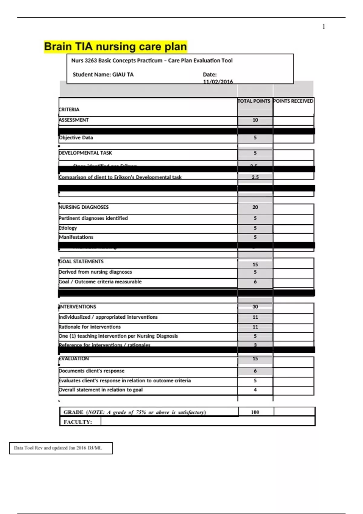Brain TIA nursing care plan GRADE (NOTE: A grade of 75% or above is satisfactory) 100 FACULTY: PRAIRIE VIEW A&M UNIVERSITY College of Nursing BASIC CONCEPTS PRACTICUM – NURS 3263 DATA COLLECTION TOOL Student’s Name Giau Ta Date 11/02/2016 Biographical data Client’s initials NN Unit/Room No. 324 Age 90 Gender F Ethnicity Asian Religion Christian Marital Status Married Occupation Retired Date of Admission 10/28/2016 Admitting Problem/Diagnosis Slurred speech Brain TIA Chief Complaint (Why did the patient come to the hospital – in patient’s own words) “While I was talking with my daughter in law, my speech was suddenly slurred and the right side of my face drooped. My daughter in law knew there was something wrong happening to me so she called an ambulance. ” Past Health History Asthma N/A Emphysema N/A Bronchitis N/A Pneumonia N/A TB N/A Angina N/A MI N/A Anemia N/A Hypertension N/A Rheumatic Fever N/A Pacemaker N/A Peripheral Vascular Disease N/A Blood Disorders N/A Stroke X Skin Disease N/A Bladder Infections N/A Kidney Disease N/A Ulcers N/A DM N/A Dental Problems N/A Fractures N/A Congenital Heart Defects N/A Surgeries N/A Family Health History Condition Family Members Condition Family Members Heart Disease N/A Tuberculosis N/A Hypertension N/A Asthma N/A Stroke N/A Mental Illness N/A Diabetes N/A Alcoholism N/A Cancer N/A Kidney Disease N/A Other Health Problems in Family: N/A Medications Prior to Admission: (List) Prescription: Potassium Chloride Nonprescription: N/A Digoxin N/A Furosemide N/A Metoprotol succinate N/A Allergies and Reactions: Identify the drugs allergic to and describe the client’s response to them: No Known Abnormal Laboratory and Diagnostic Studies Please list any abnormal results that your patient had and implications related to abnormal findings. Diagnostic Study Result Implication Glucose Level 208 mg/dL (H) 70-110mg/dL Type 2 diabetes, sever stress on the body from diseases, chronic kidney failure, pancreatitis, hyperthyroidism Complete Blood Count- RBC 3.16 k/uL (L) 4.0-10.0 k/uL Implication of anemia, nutritional deficiency, chronic inflammatory disease, and kidney disease CBC-HGB 10.7 g/dL (L) 12.0-16.0 g/dL Anemia, emphysema, asthma, nutritional deficiency CBC-HCT 31.8 % (L) 36.0-48.0 % Anemia, kidney failure, nutrition deficient CBC-MCV 101 um3 (H) 78-98 um3 Kidney failure, iron-deficiency anemia, Calcium 8.0 g/dL (L) 8.5 - 10.5 mg/dL Inadequate intake, Vit D deviciency, renal failure, hypoparathyroidism Total Protein 5.6 g/dL(L) 6.0 - 8.3 g/dL Malnutrition, Agammaglobulinemia, Liver disease Albumin 2.6 g/dL(L ) 3.5-5 g/dL congestive heart failure, pericarditis other Tests or Procedures: Chest X-Rays, CT scan, Blood test, MRI, Accu-Chek