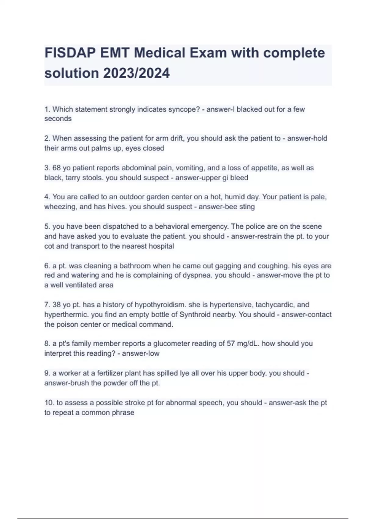FISDAP EMT Medical Exam with complete solution 2023/2024